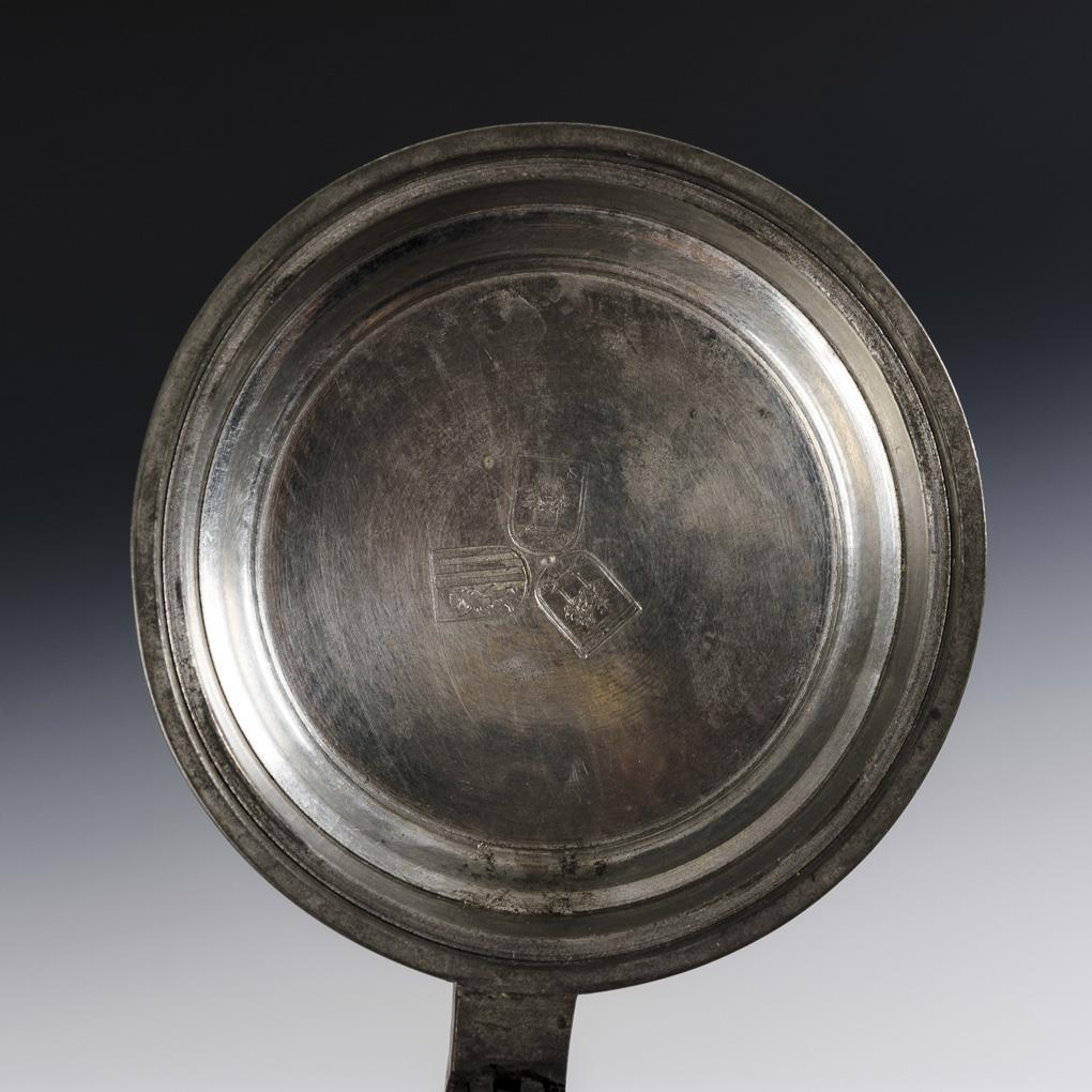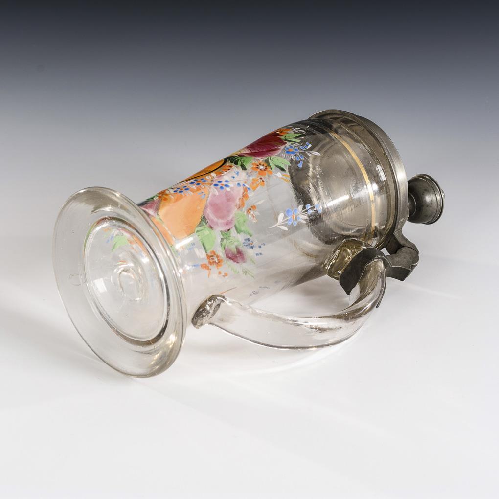 Slightly conical jug with ribbon handle and pewter mounted hinged lid, demolition. On the front a bouquet of flowers with an orange cartouche, within the dedication "Health prolong your life.". Tension crack at the base of the handle, gold rubbed.