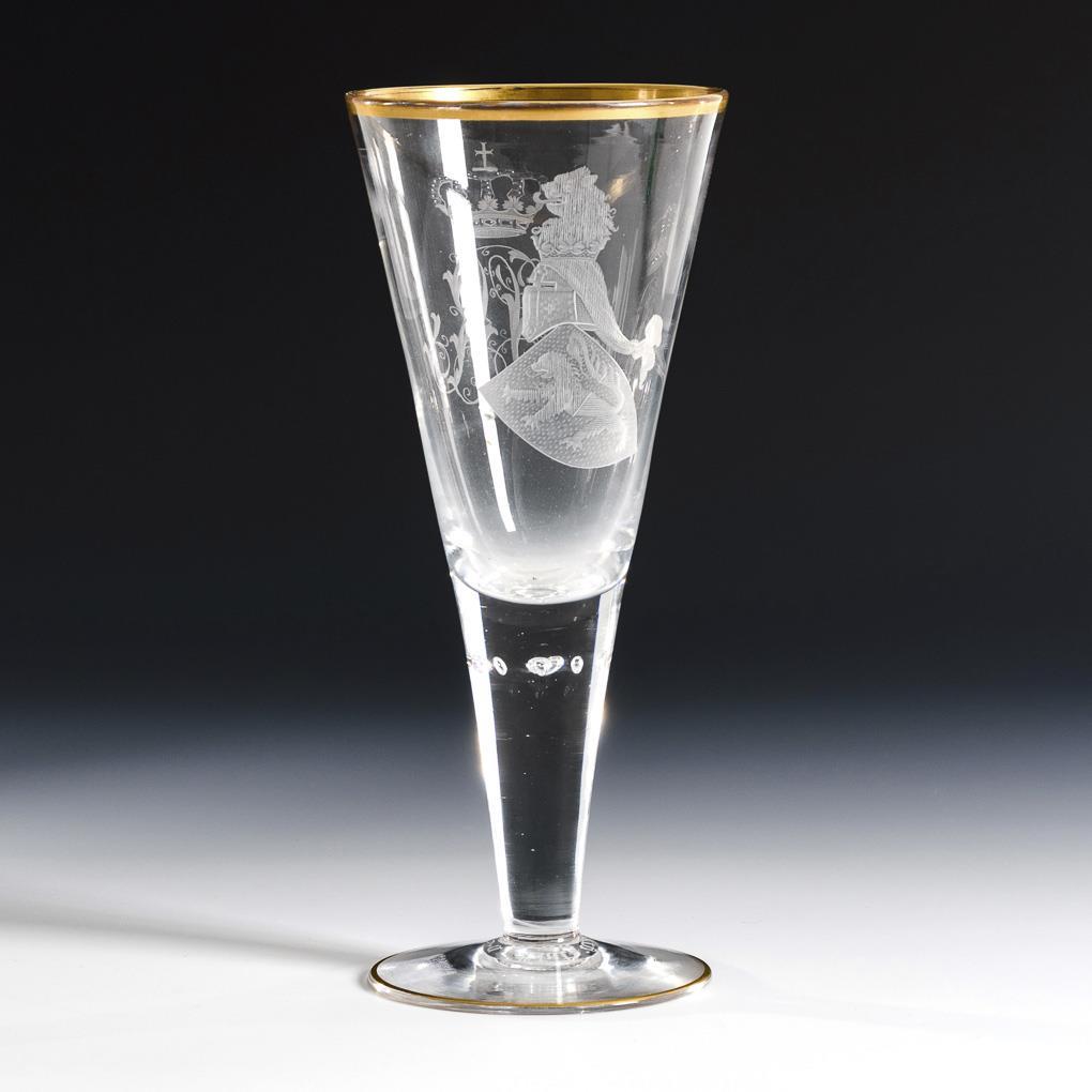 Conical dome merging into the solid stem with fused bubble wreath, round foot, dislocated finial. On the dome the engraved coat of arms of the noble family von Schönberg, on the verso the crowned monogram "IR", on the dislocation the inscription "Ltnt. von Schönberg 1899". Minimal gold abrasion.