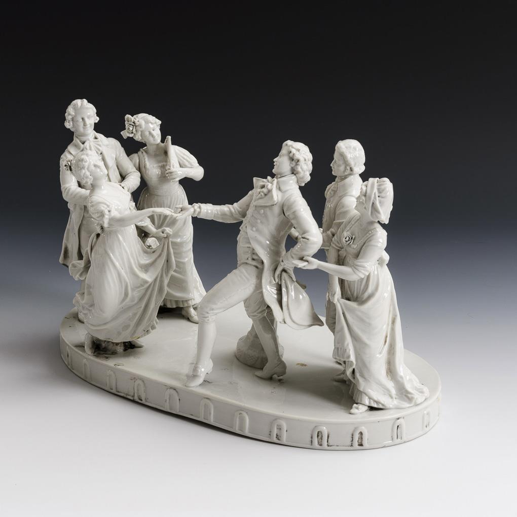 Six-figure group with a dancing couple and two couples watching the couple. 1 figure glued, 1 cloth tail bumped, base warped.