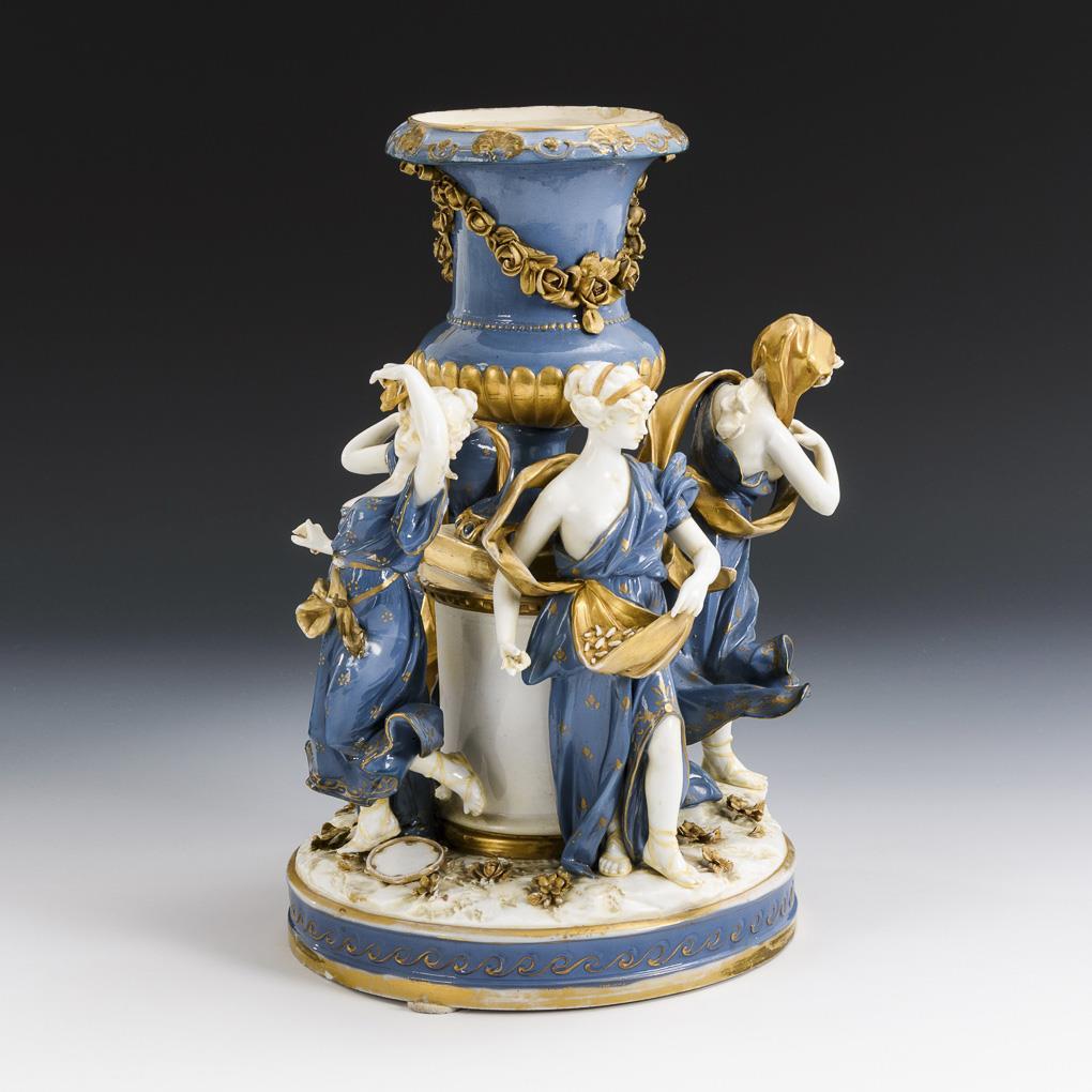 Crater vase with rose garland standing on a pedestal, around the pedestal four allegorical female figures. 1 figure glued and restored, 1 finger and some flowers minimally bumped.
