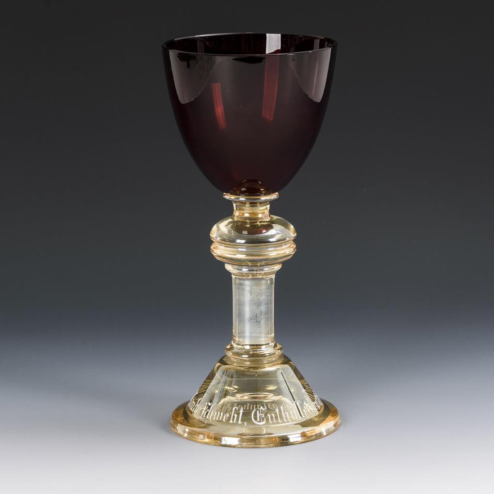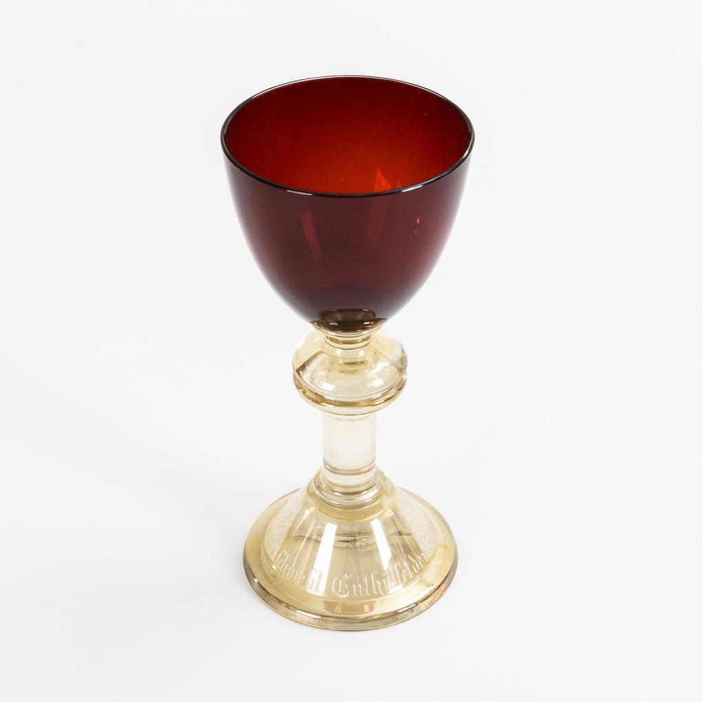 Colourless glass with ruby red inner catch on the cupola, partly lustrated. H 25 cm.