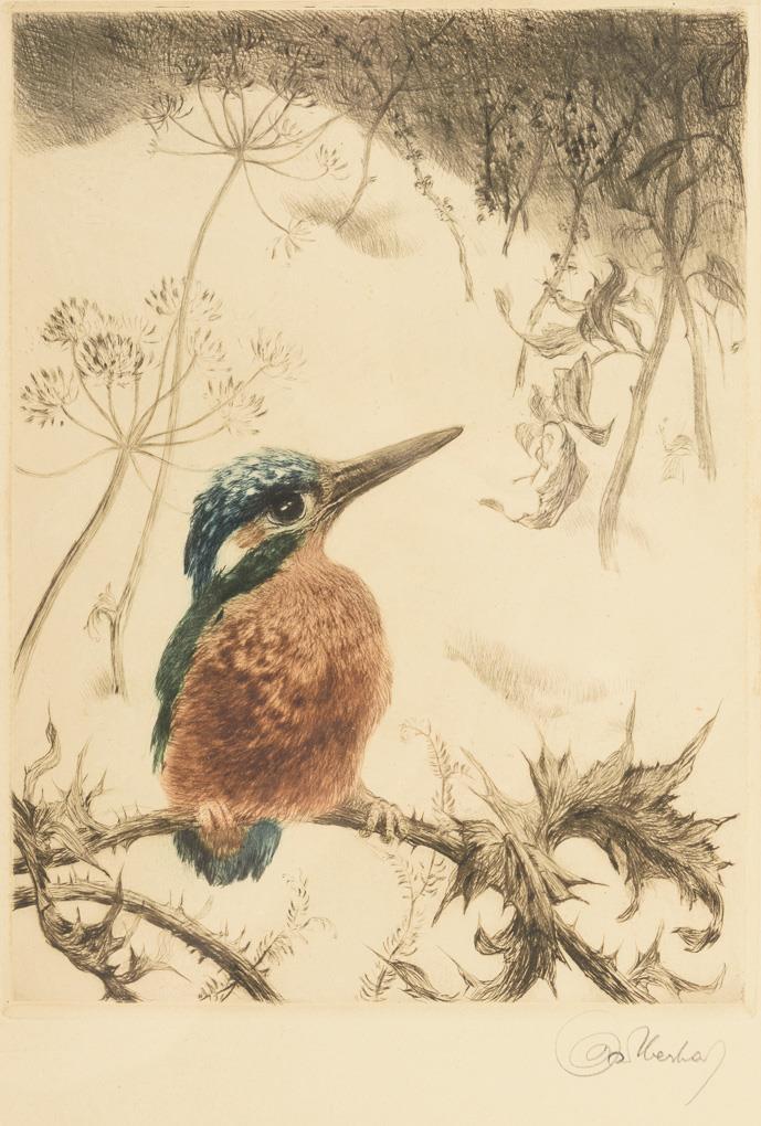 Hare in the Snow, plate: 23.5 x 20 cm, framed & behind glass: 45 x 34.5 cm, marginal area with water stains | Robin on Thistle, plate: 27.5 x 20.5 cm, framed & behind glass: 41 x 31.5 cm, with light damage.