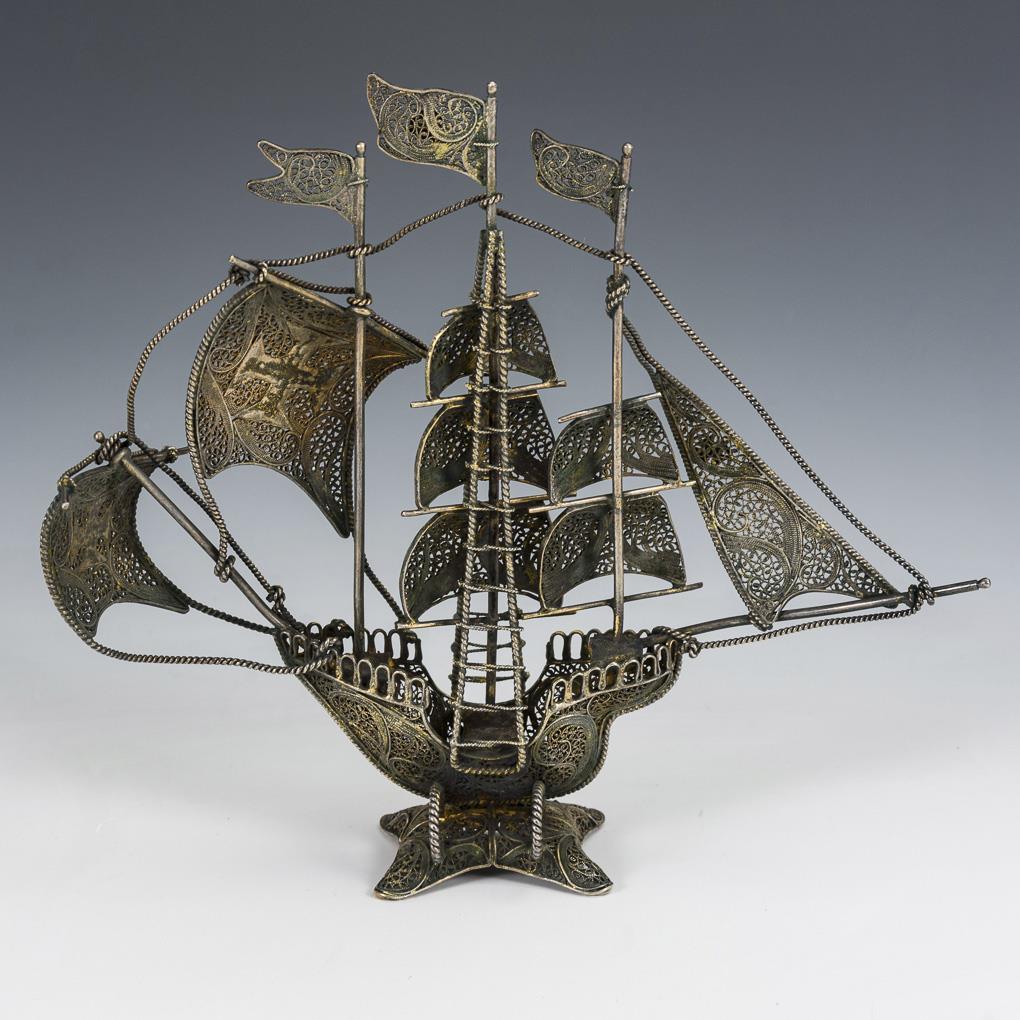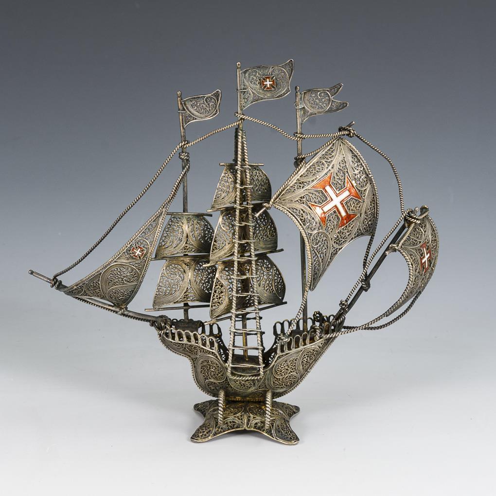 Finely crafted three-master with red and white enameled Order of Christ (Portugal) on the sails.