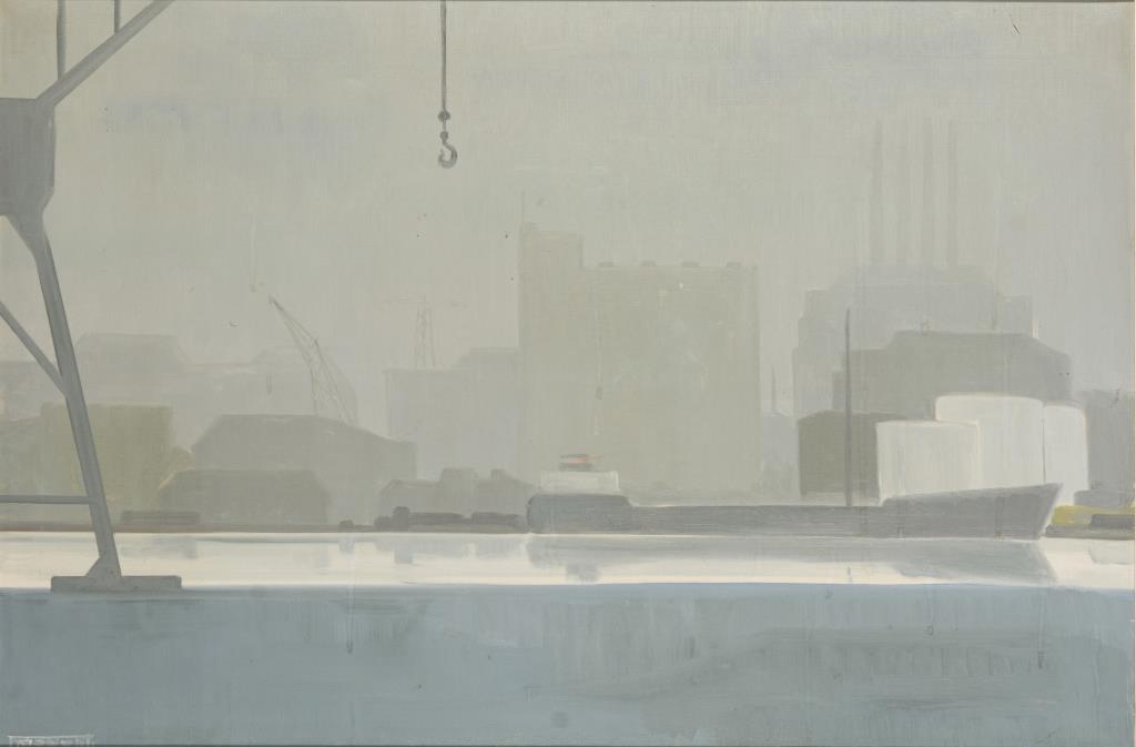 Schematisch und in Grautönen gemalte Hafenansicht.