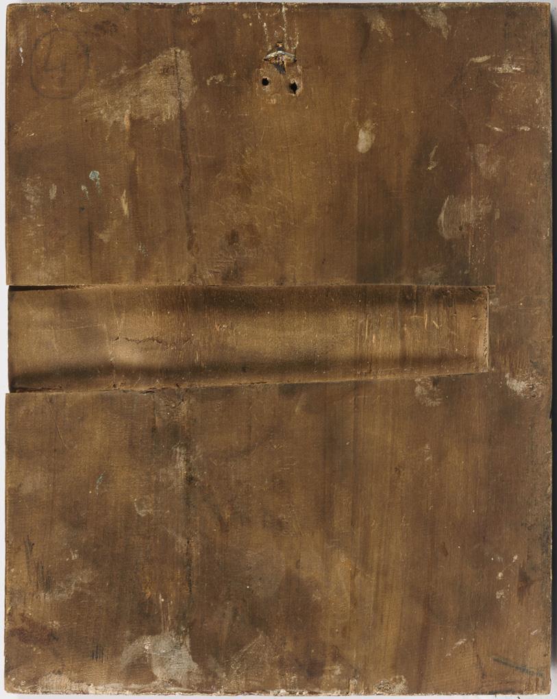 Mary as intercessor of the needy, surrounded by angels and those seeking help. Traces of age.