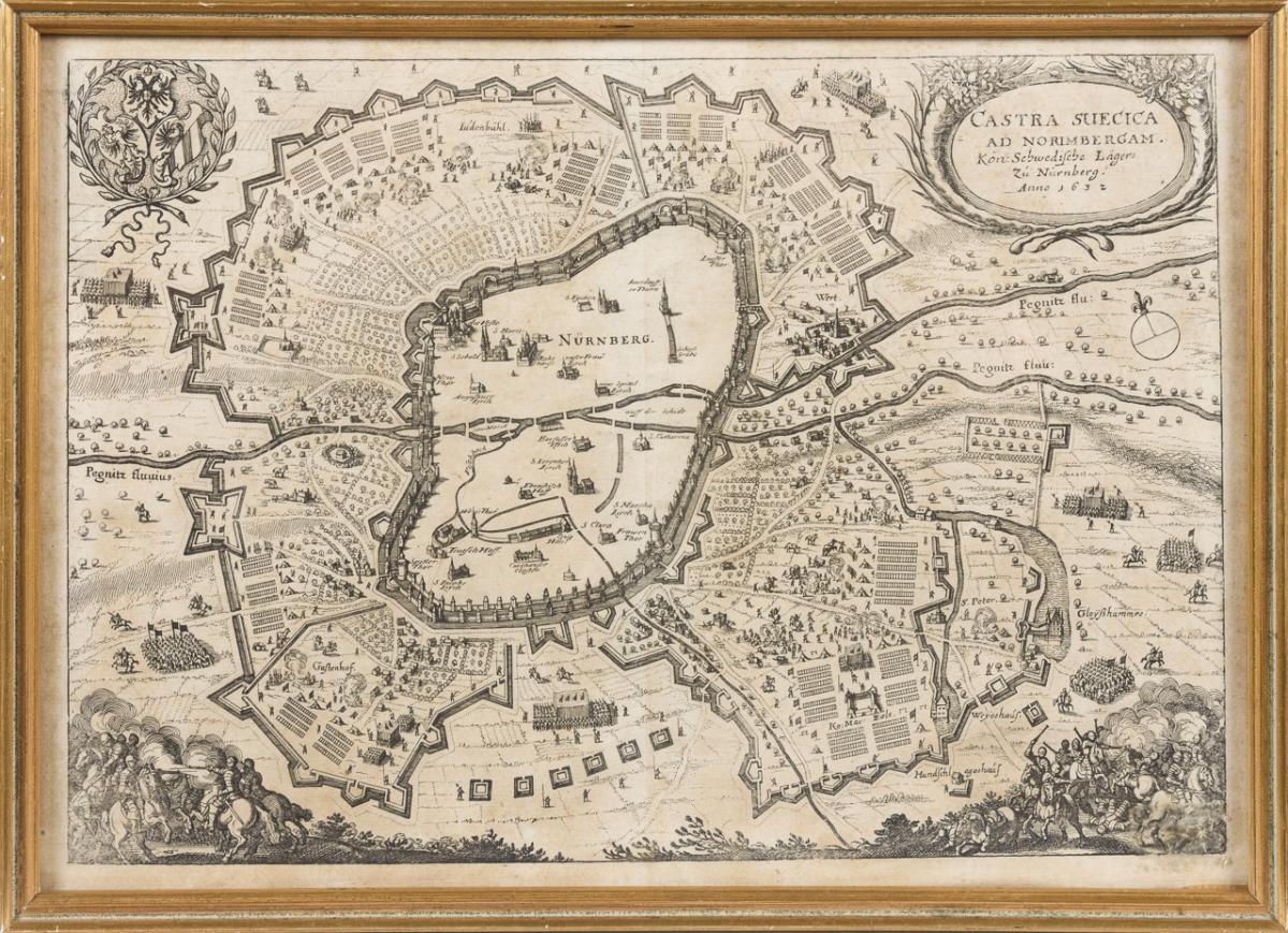 Detailed general view of the city of Nuremberg under siege from bird's-eye view, city arms and title-cartouche "Castra Suecica Ad Norimbergam. Kön. Schwedische Läger Zú Núrnberg, Anno 1632", with numerous soldierly staffage figures; from "Theatrum Europaeum", 1629 - 1650. Buck crease, foxing.