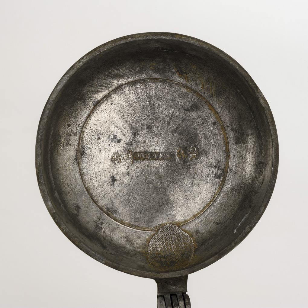 Cylindrical form with lined ribbon handle. Incised decoration with central bird motif and leafy vine arch, dotted decoration. Domed pewter lid with ball pusher, indistinctly hallmarked, linen stain inside. Slight signs of age and wear.