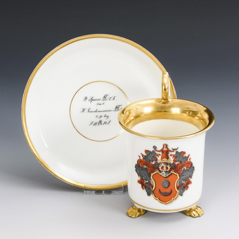 Cylindrical cup with crater rim, three paw feet and rosette handle. On the front a coat of arms with silver skull and crescent moon on red shield. In the mirror of the saucer the dedication "G. Spiess (...) C. K. s/m l. H. Lindemann (...)! Zr. fr. erg. (...)18(...)84S.". Minimal gold rubbing on the saucer rim, minimal bumping at 1 foot.
