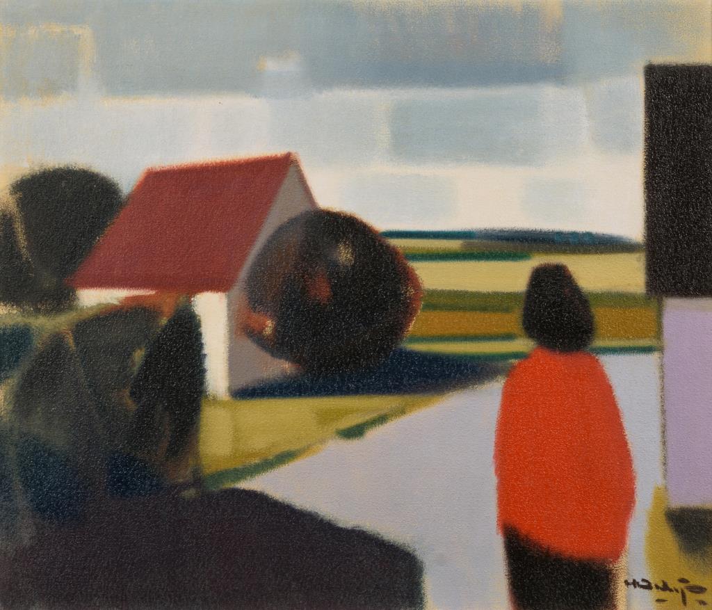 Naive Darstellung einer Straße mit Einfamilienhaus und einer in Rot gekleideten Person.
