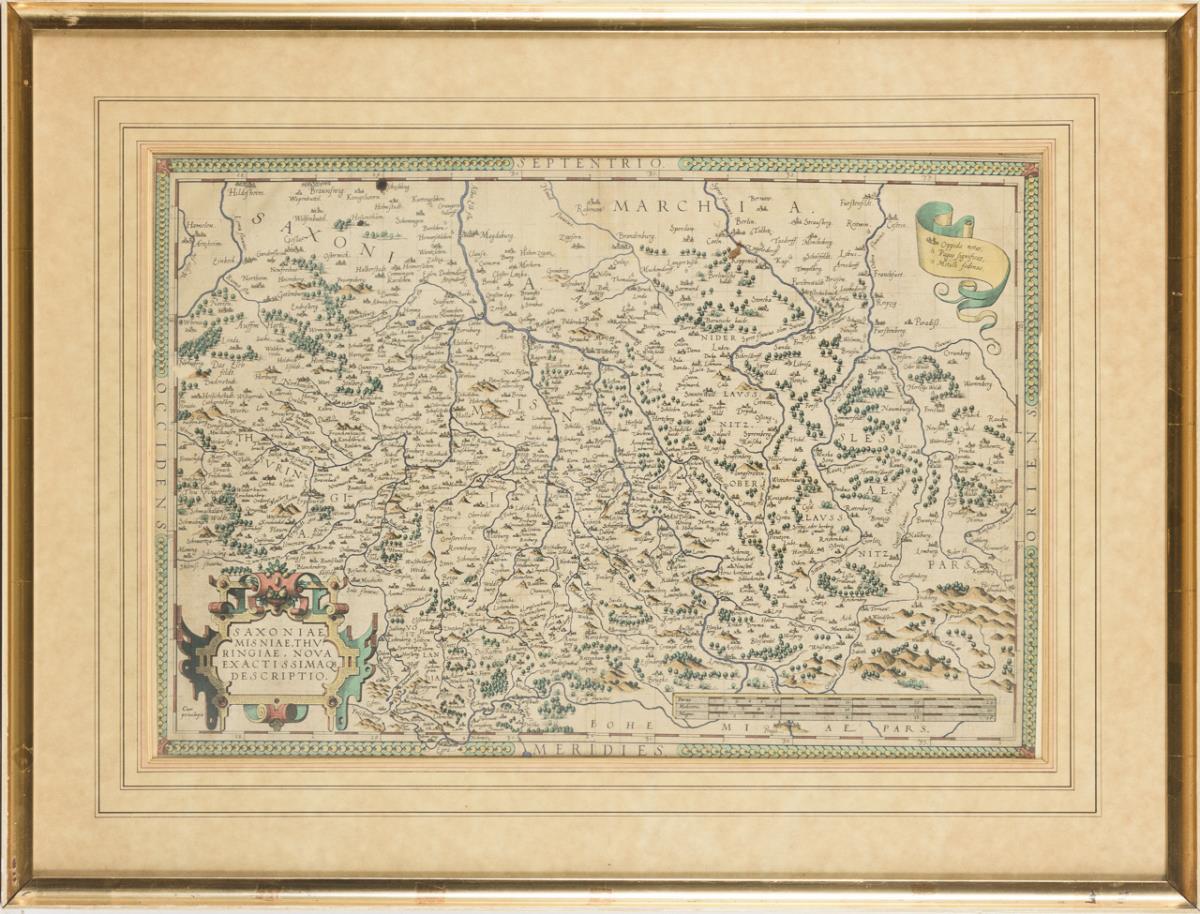 Detailed map of Saxony, Saxony-Anhalt, and Thuringia, with scrollwork cartouche "Saxoniae, Misniae, Thuringiae, Novae exactissimaq. Descriptio"; from "Theatrum Orbis Terrarum", 1603. crease, creased, somewhat stained.
