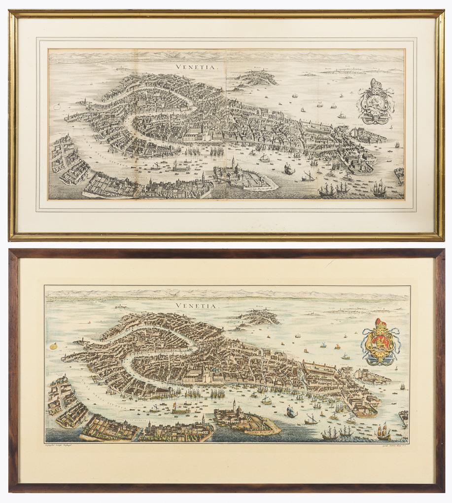 2 identical, finely detailed city views of Venice after a drawing by Georg Hoefnagel (1542 Antwerp - 1600 Vienna), with city arms, inscribed "Venetia" - 1x younger, colored reprint of the printing plate by Willem Janszoon Blaeu (1571 Alkmaar - 1638 Amsterdam), framed & behind glass: 47 x 84 cm, in the upper margin with small tears | 1x uncolored, framed & behind glass: 47 x 88 cm, printing plate by Matthäus Merian (1593 Basel - 1650 Schwalbach), folded several times, some foxing, composed of 2 parts.
