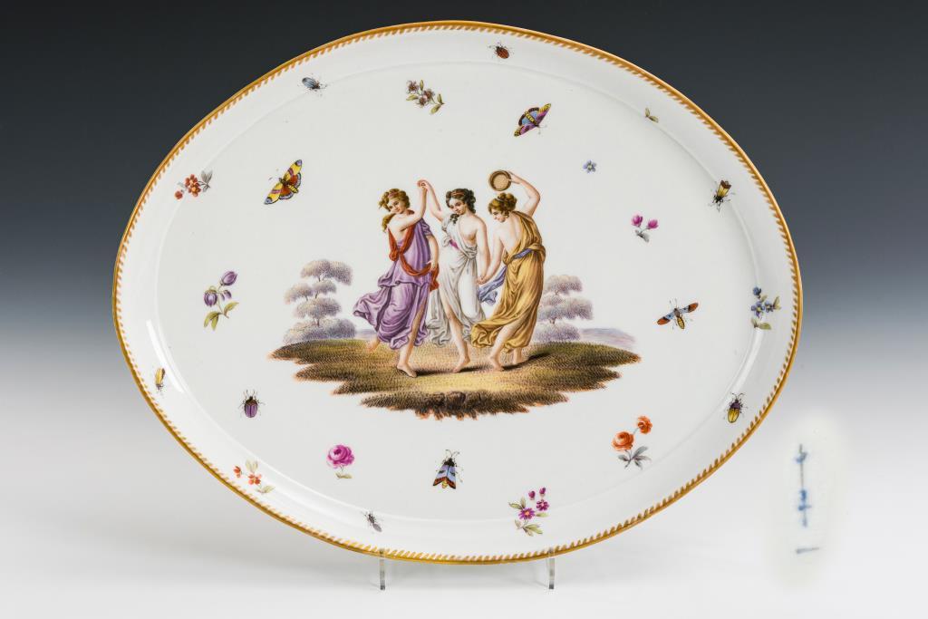 Ovales Tablett mit der Darstellung der drei tanzenden Grazien, umgeben von Insekten und Streublümchen. 1 Randrestaurierung, unterseitig Mittelsteg bestoßen, dort Glasur krakeliert.