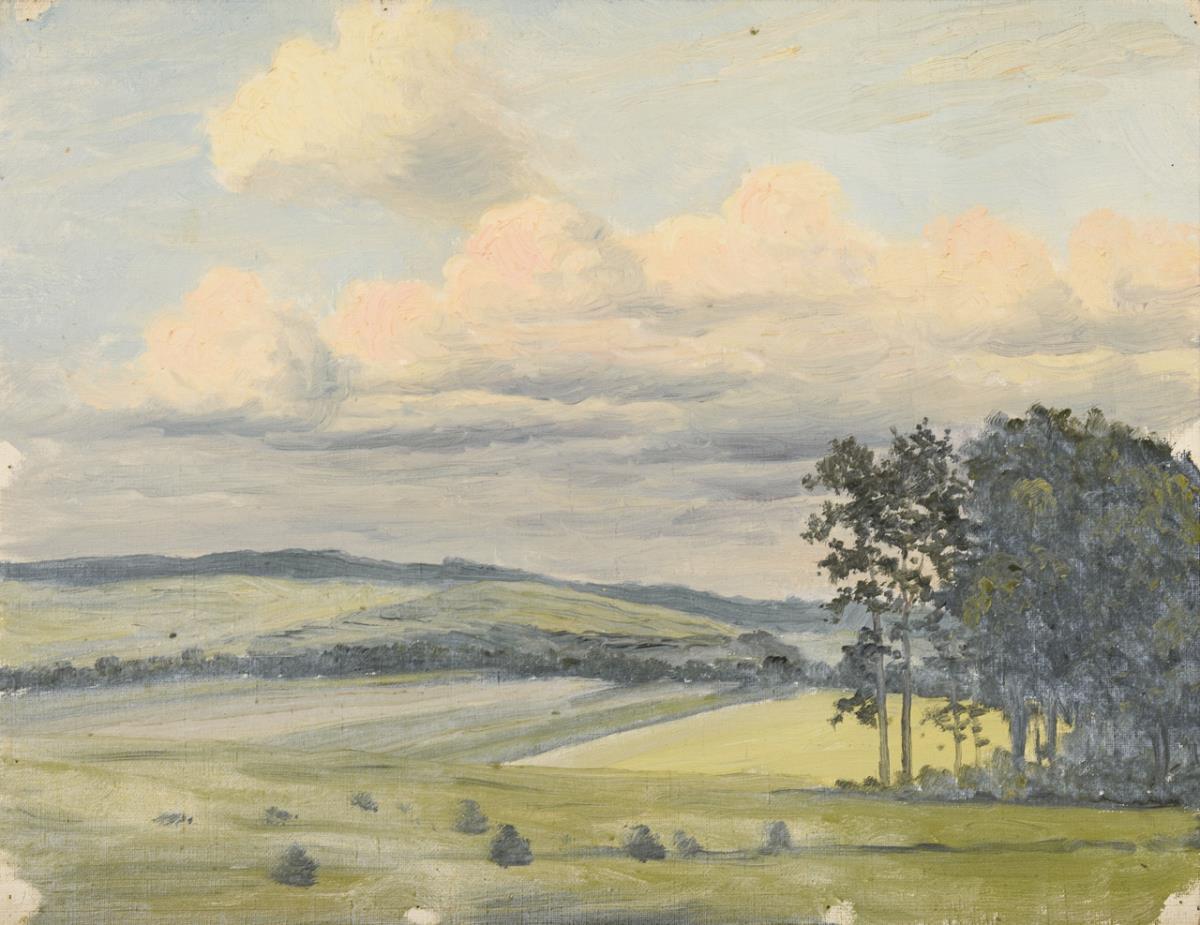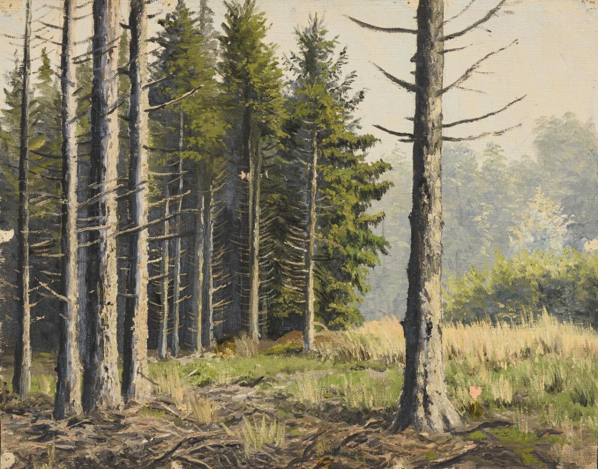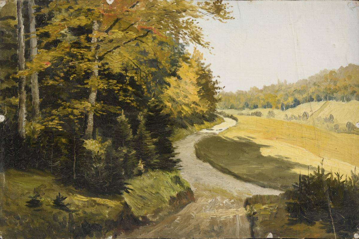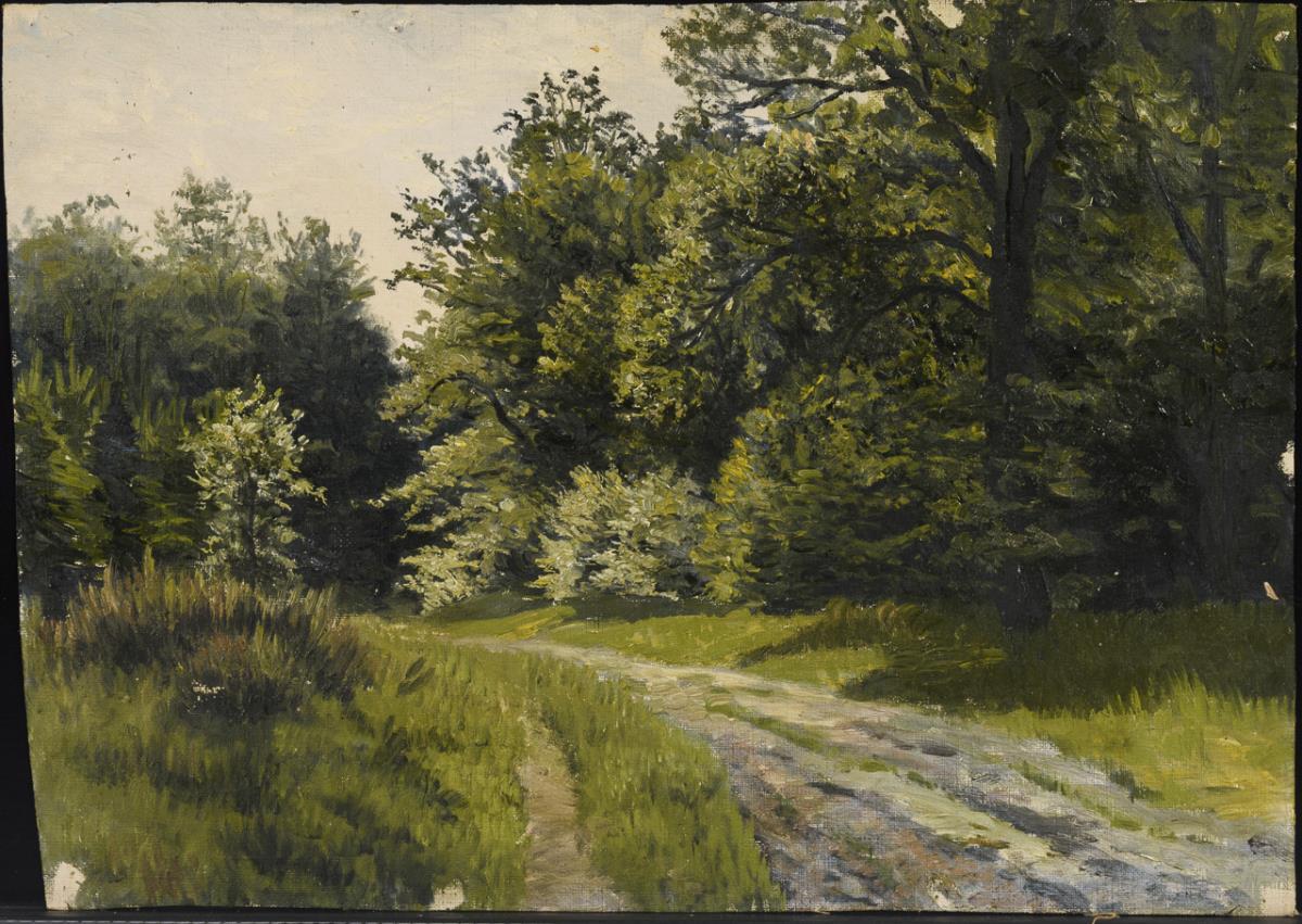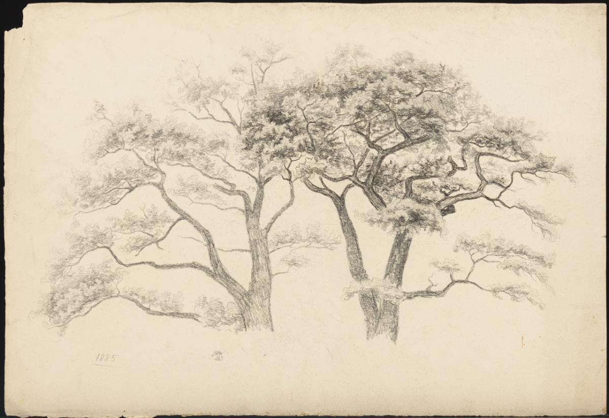 Landscape painting and various tree studies. Kinks, slight tears at margins, pinholes at corners.