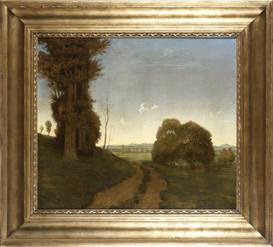Wide, flat landscape with single groups of trees under a blue sky depicted in glazing painting manner and with partly parts reminding of graphics. Light traces of age.