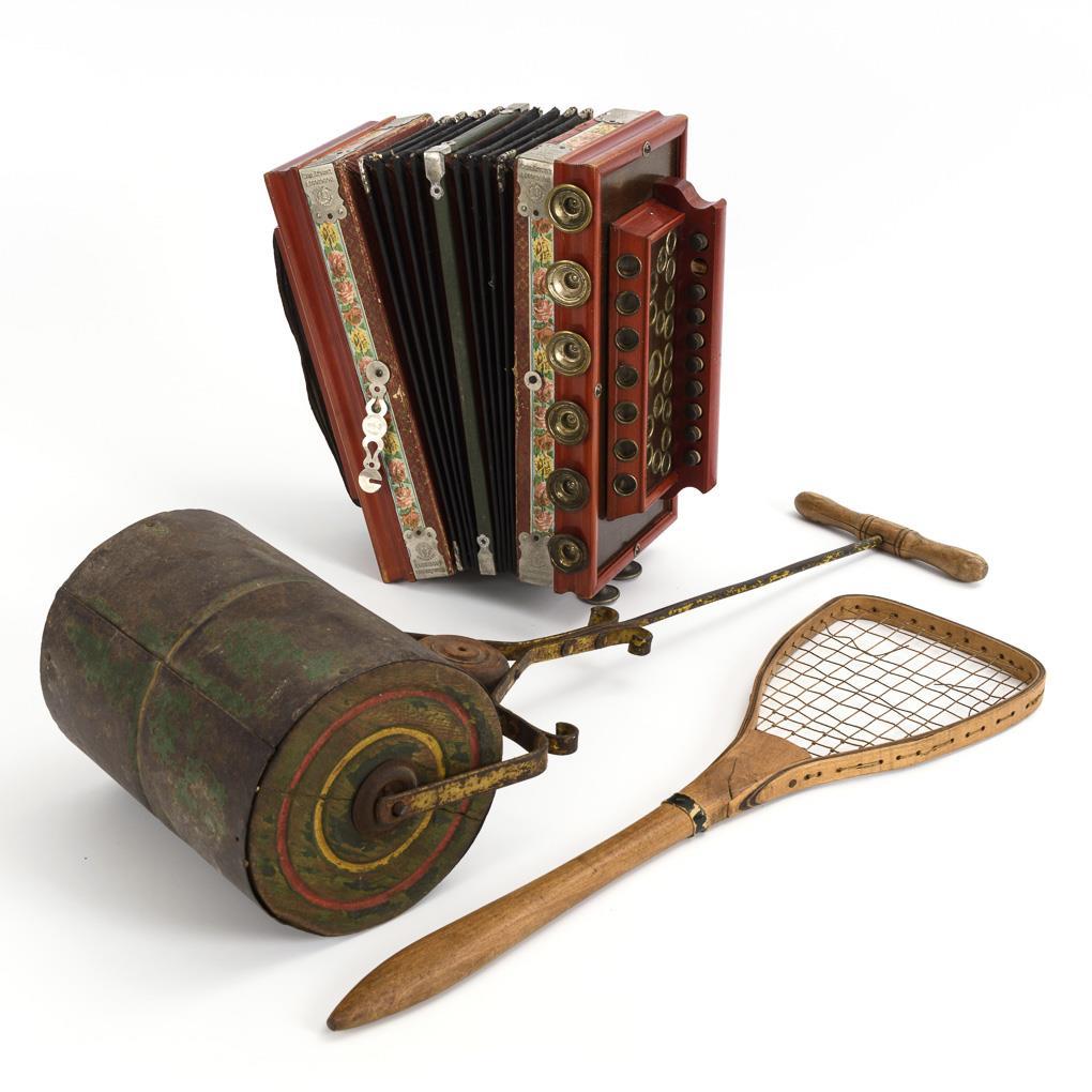 "Gebr. Ludwig's Accordeon, steel bronze reeds" with red wooden case. Intact, 1 button missing. / Tennis racket with defective stringing. / Children's toy large rattle roller with heavy signs of age.
