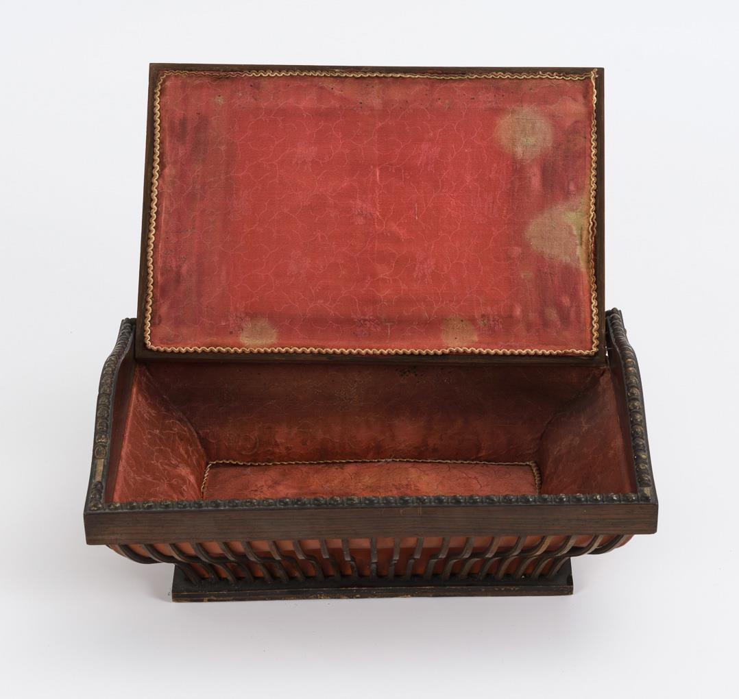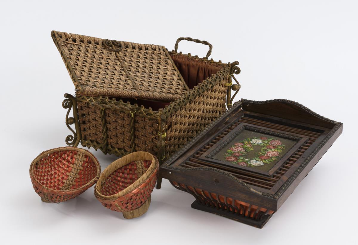 Biedermeier wooden basket with embroidered roses on the lid. Wicker basket with defective lid. Oval egg-shaped basket. Signs of age and defects.
