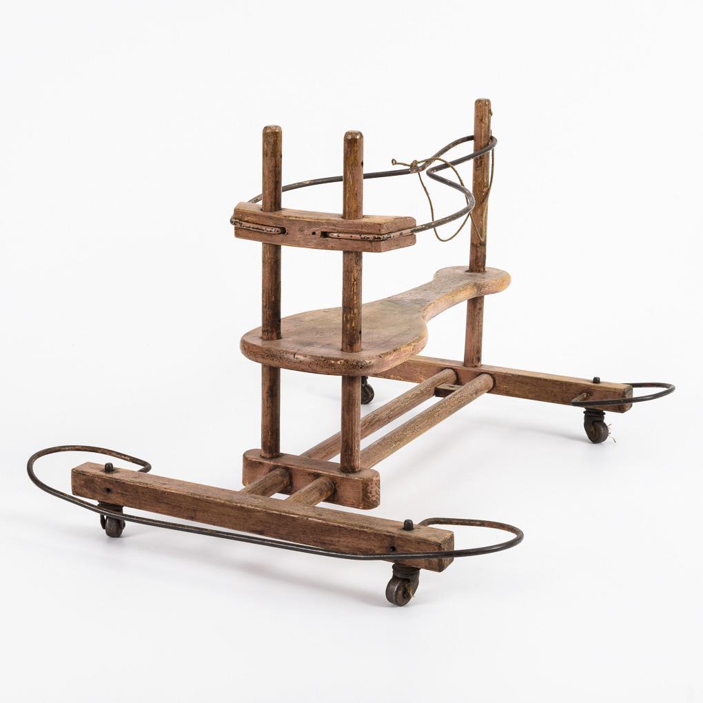 Walker or so-called "Gehfrei" with iron arches and 4 small wheels. Signs of age and use, paint residues.