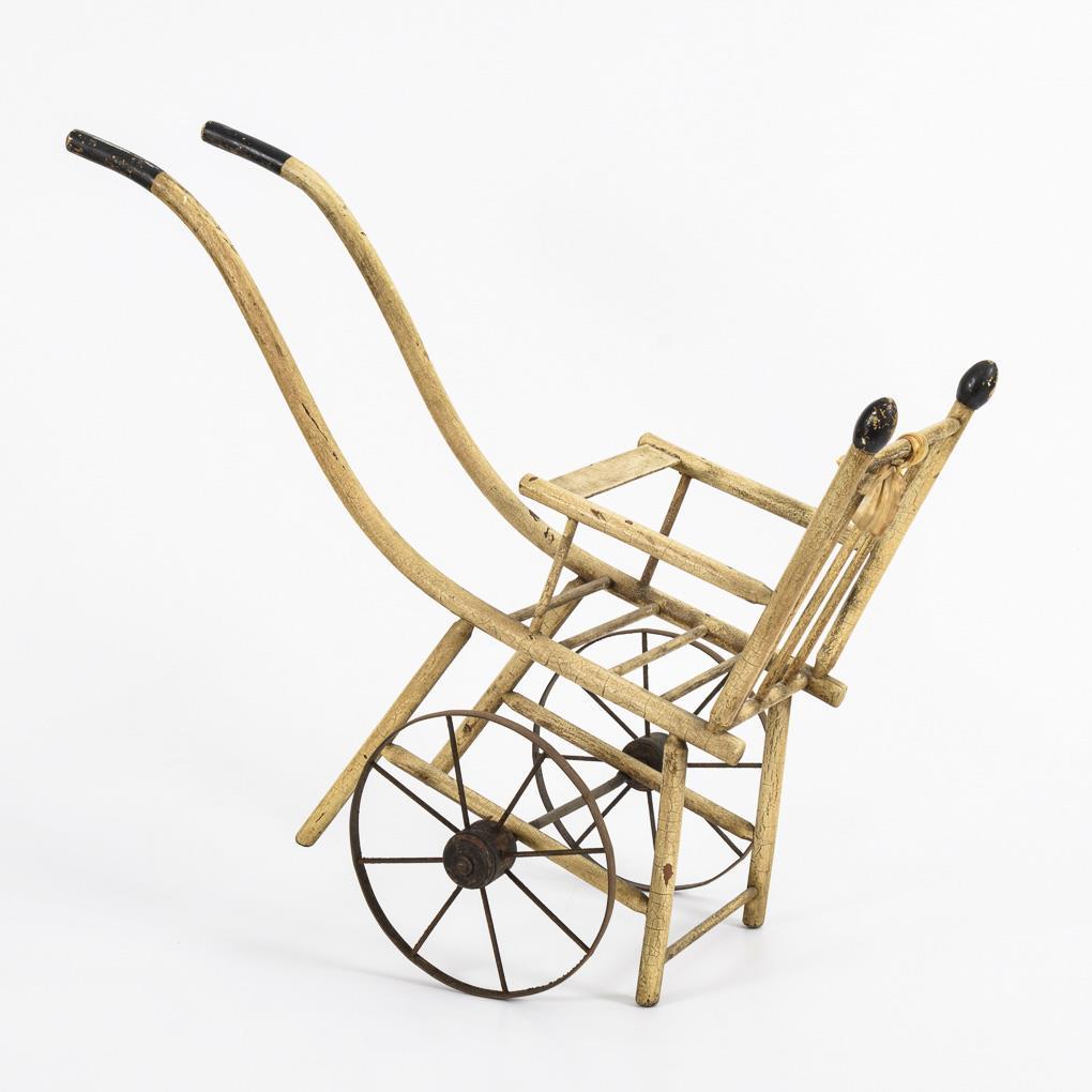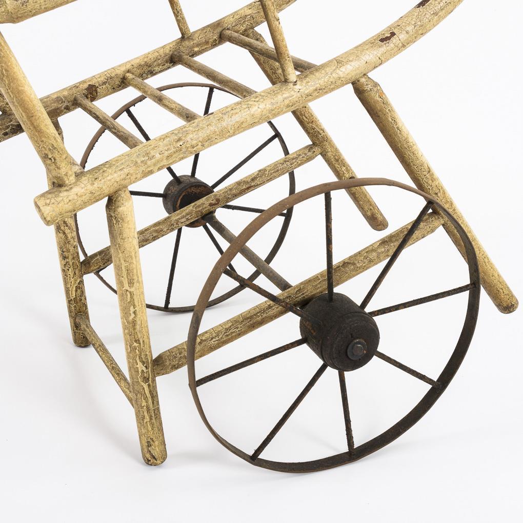 Black and white painted trolley with 2 handles and 2 spoke wheels. Signs of age and use, paint defects.