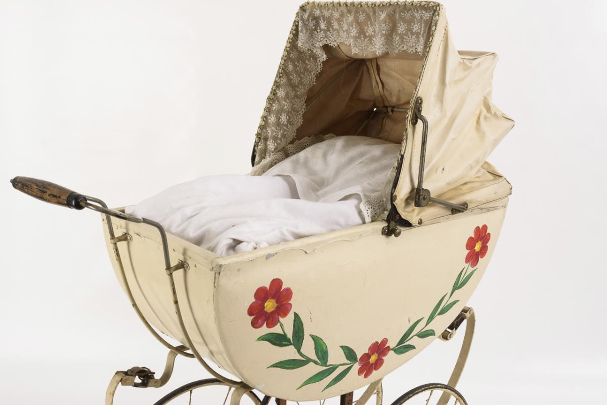 Overpainted tub with canopy, on iron frame with spoke wheels. In addition large old plug-in cushion. Flower painting younger, borders on the canopy supplemented. Signs of age and use.