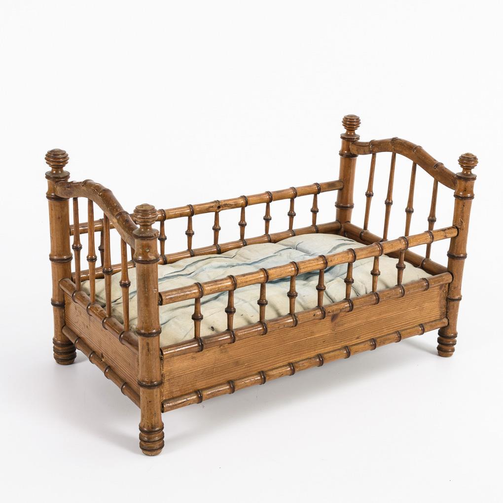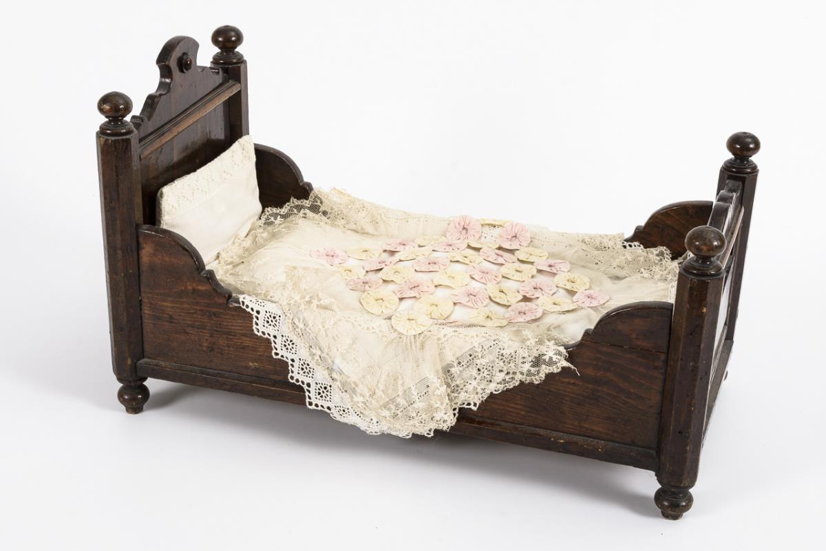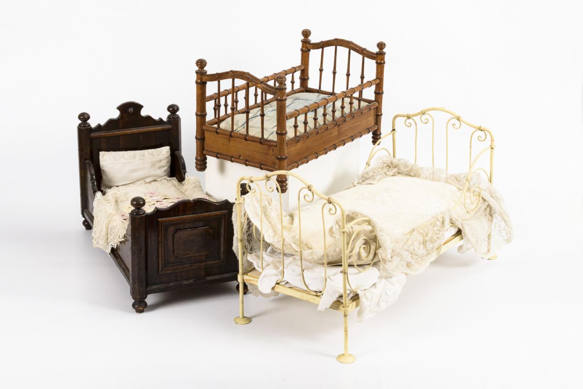 White iron bed with old linen, canopy missing (L 60 cm). / Wooden bed in bamboo look, with old mattress (L 45 cm). / Wilhelminian wooden bed with curved headboard and old linen (L 53 cm). Signs of age and wear.