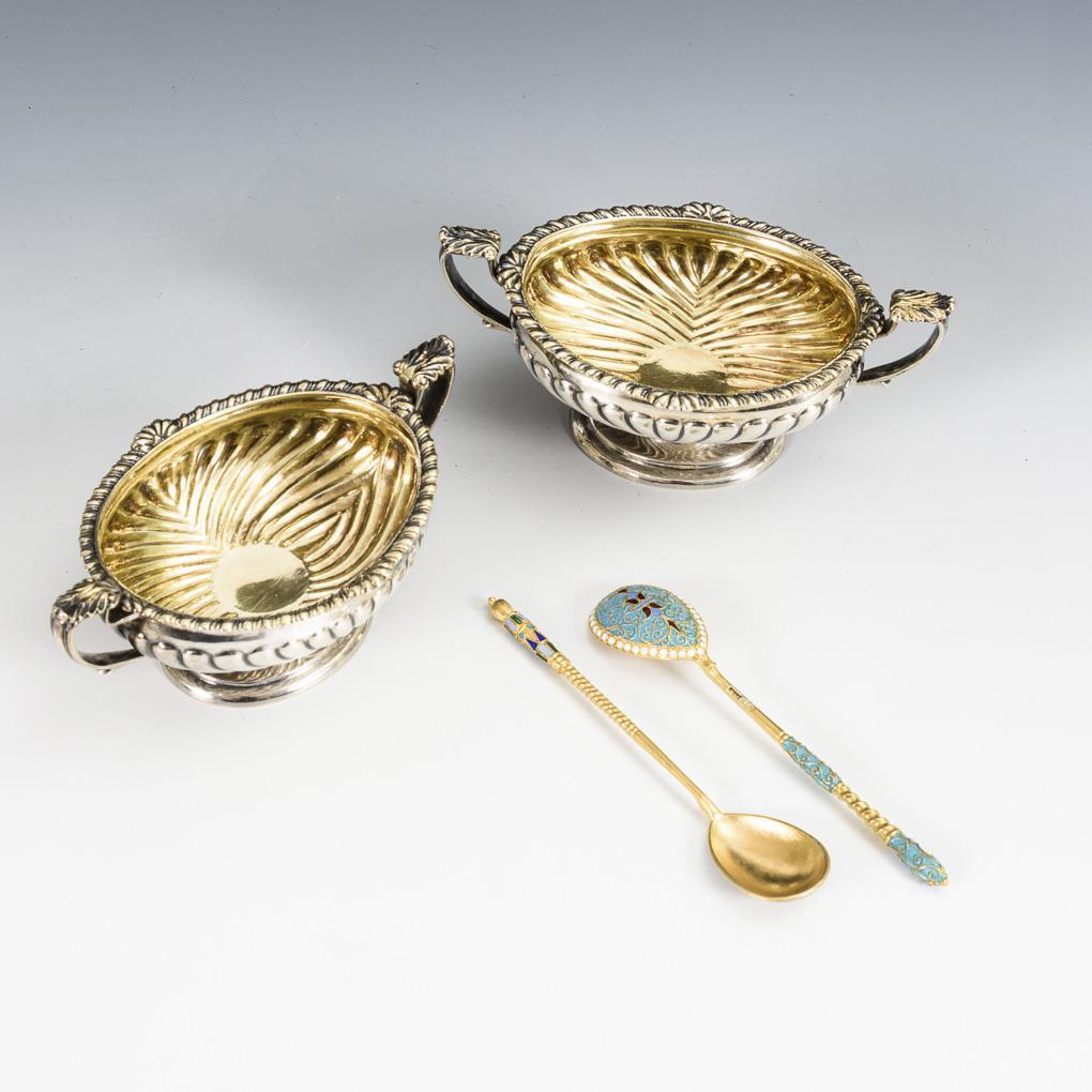 2 Russian caviar bowls and 2 gilt spoons.