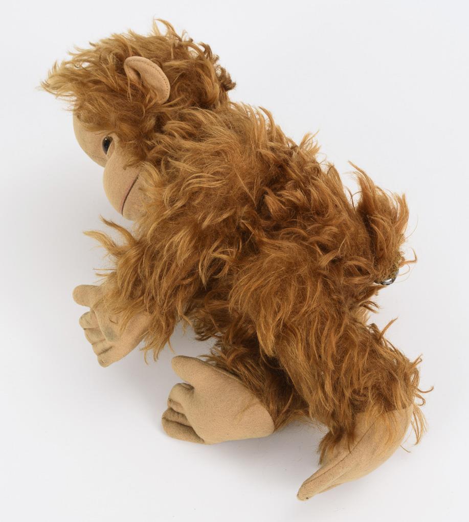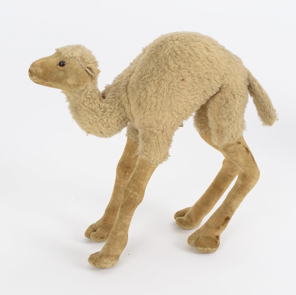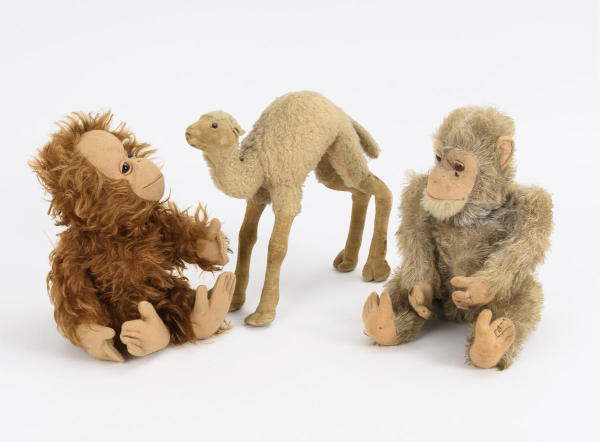 Orangutan with Yes-No mechanism. / One-humped Steiff camel with velvet legs (white flag "US-Zone Germany"). / White chimpanzee with silenced print voice. With small defects.