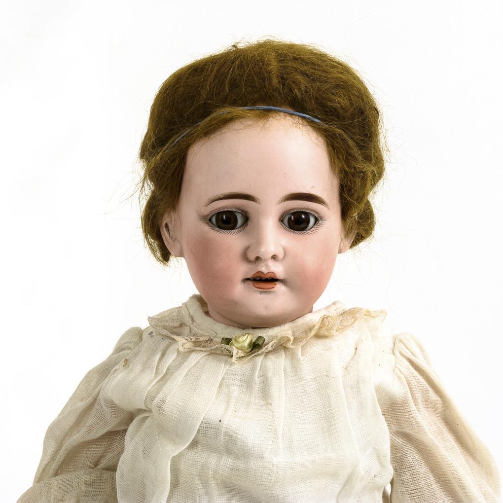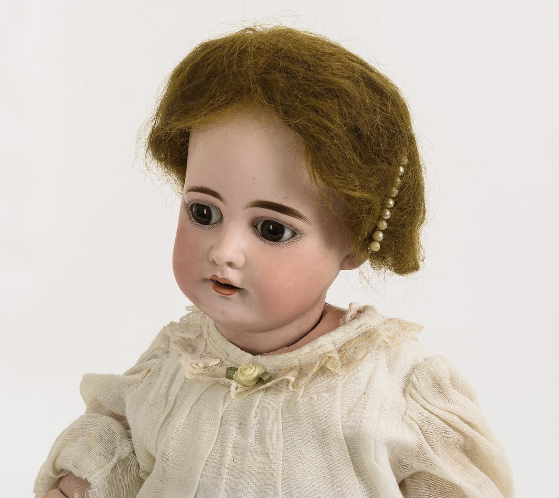 Crank head, brown sleeping eyes, auburn mohair wig. 15-piece jointed body. White dress, black leather shoes. Head x-rayed: without defects, but sleeping eyes plastered down. Right foot with repair, small paint defects on body.