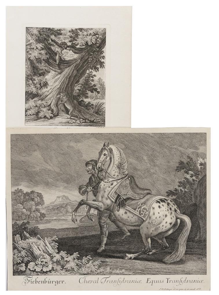 "Tree Marten No. 86", plate: 18.5 x 15 cm, sheet: 28 x 21 cm | "Siebenbürger. Cheval Transylvanie. Equs Transylvaniae", plate: 27 x 34,5 cm, sheet trimmed | "If you hide your face, they will shudder; [...]", plate: 36,5 x 27,5 cm, sheet: 38 x 29,4 cm, sheet foxed and with light damage | "Anno 1721 haben Ihro Chur-Fürstli. Durchl. zu Trier Franciscus Ludovicus this stag [...]", plate: 34,8 x 26,5 cm, sheet: 42,5 x 35 cm, younger reprint, light damage [ "Ein Hirsch von 8 änden, welcher gantz [...], plate: 34.5 x 43 cm, sheet: 39.3 x 49 cm, younger reprint, corner upper left with defect, somewhat grip-marked.