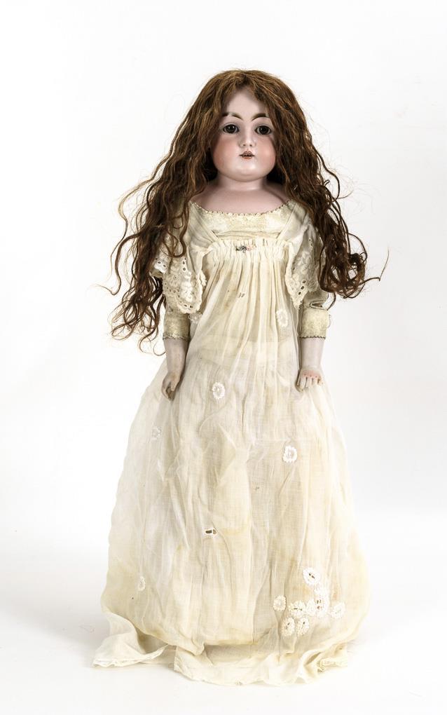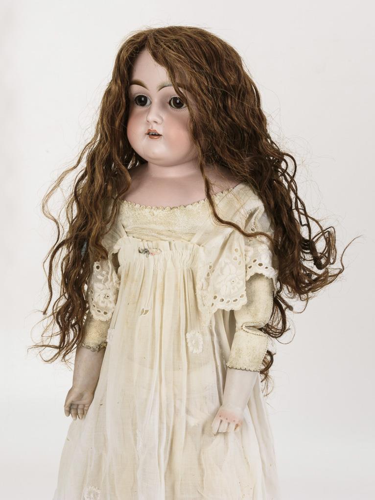 Chest head with tightly plastered lid, brown sleeping eyes, long brown curly wig. Leather body, bisque forearms, gussets at knees and elbows. Long white dress. Knee and left hand defective, body trickling a little.