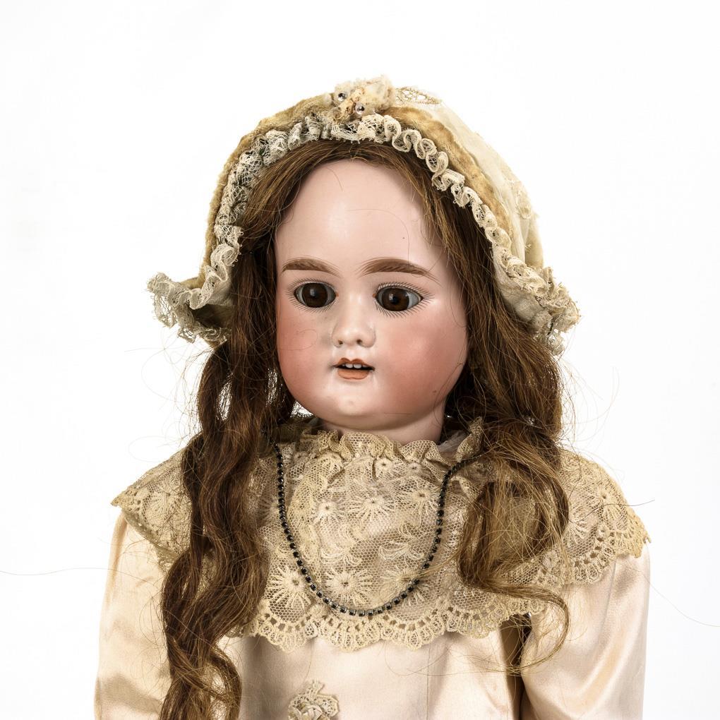 Crank head, brown sleeping eyes, auburn human hair wig. 15-piece limb body. Elegant pale pink dress, matching bonnet, defective black shoes. Head x-rayed: without defects. Body with color defects and overpaint, tension somewhat loose.