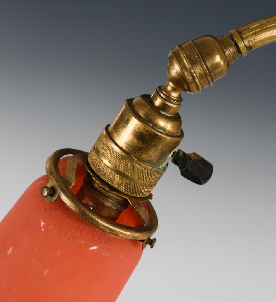 Glockenschirm mit dreifach gekniffenem Rand. An gebogtem Leuchterarm aus Messing mit verstellbarem Schirm, herzförmiger Fuß. Elektrifiziert (Funktion nicht geprüft).