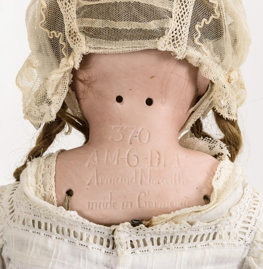 Brown sleeping eyes, dark blond human hair wig. Leather body with jointed arms. Long white dress, bonnet. Head x-rayed: without defects. Eyelids rubbed, upper arms with color defects, knee seams resewn.