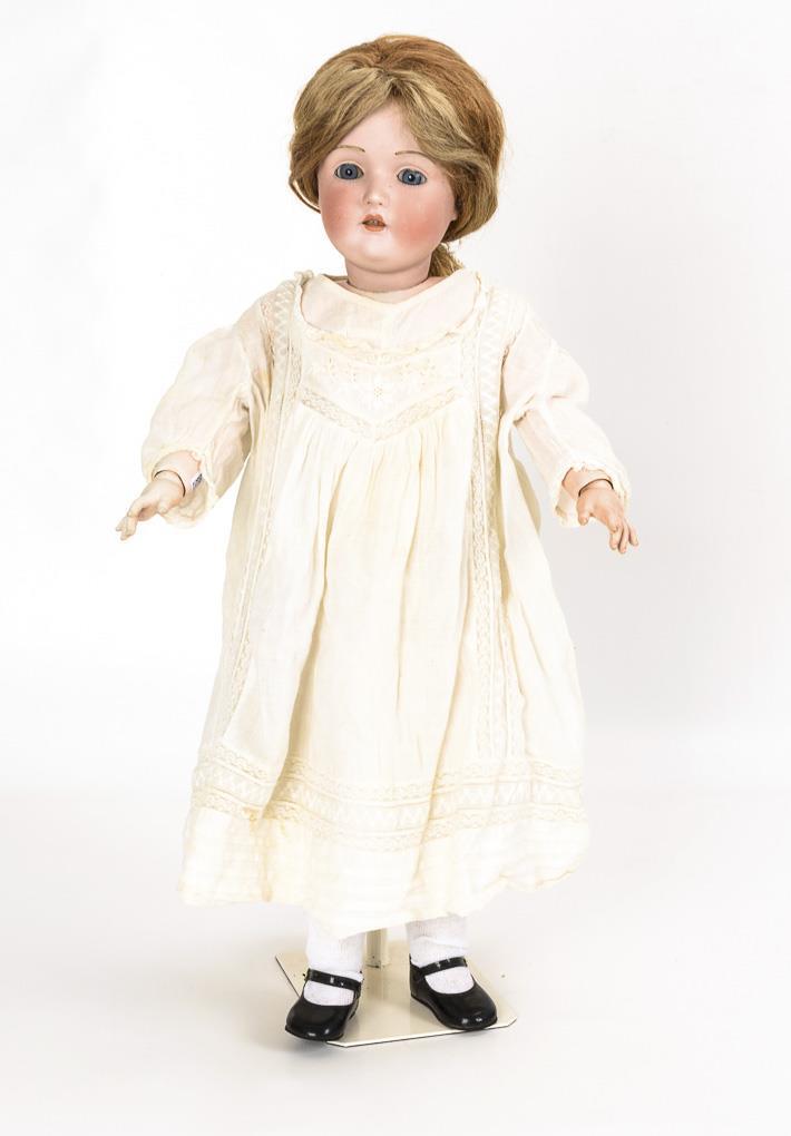 Crank head, blue sleeping eyes, real hair wig, remnants of inlaid fur eyebrows. 15-piece limb body. Old white dress, black patent shoes. Hair cracked at back of head. Body with paint defects and repairs.