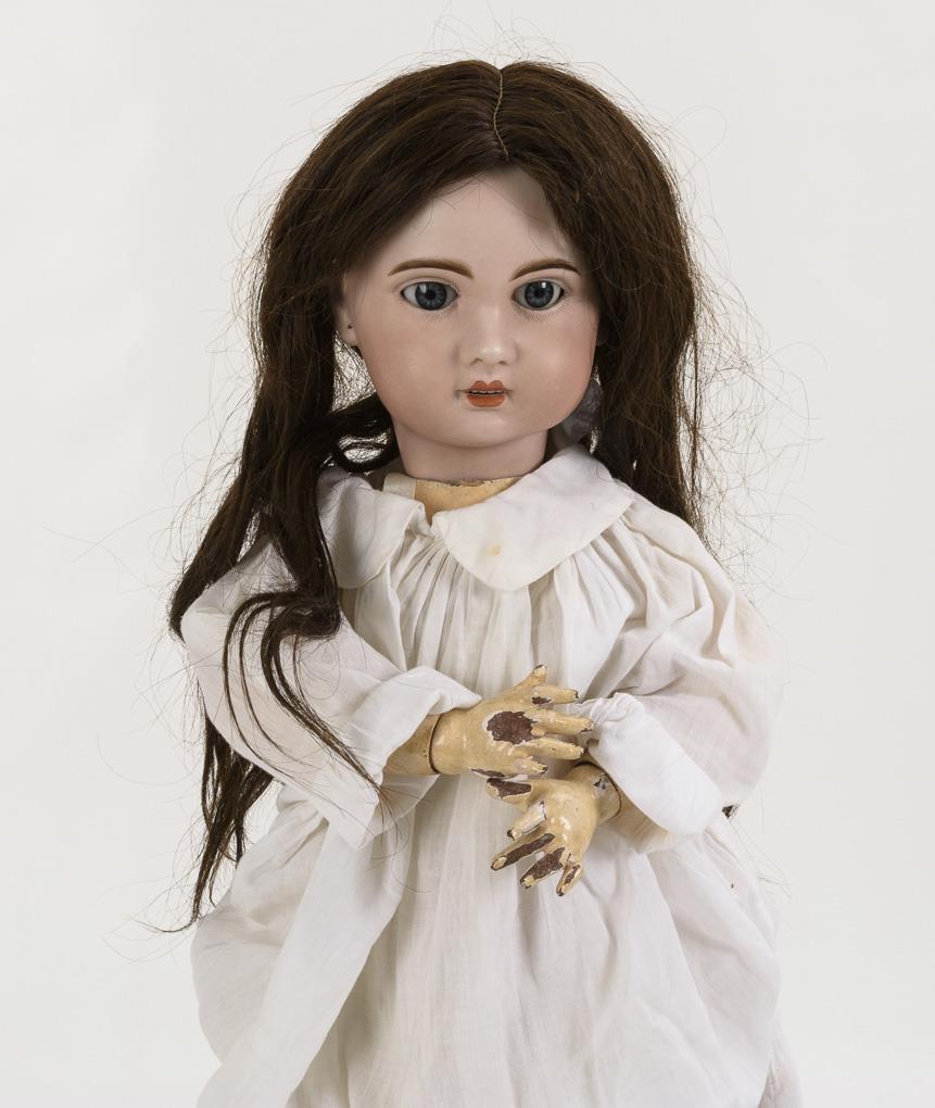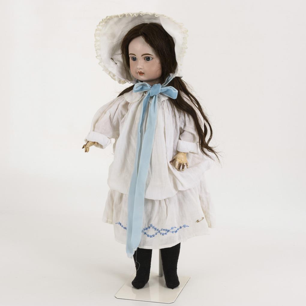Crank head, fixed blue paperweight eyes, open mouth with row of teeth, brown human hair wig. 9-piece limb body with stiff legs. White dress with blue embroidery, white bonnet, black stockings. Hair crack spider on right temple. Body with paint defects, especially on the hands.