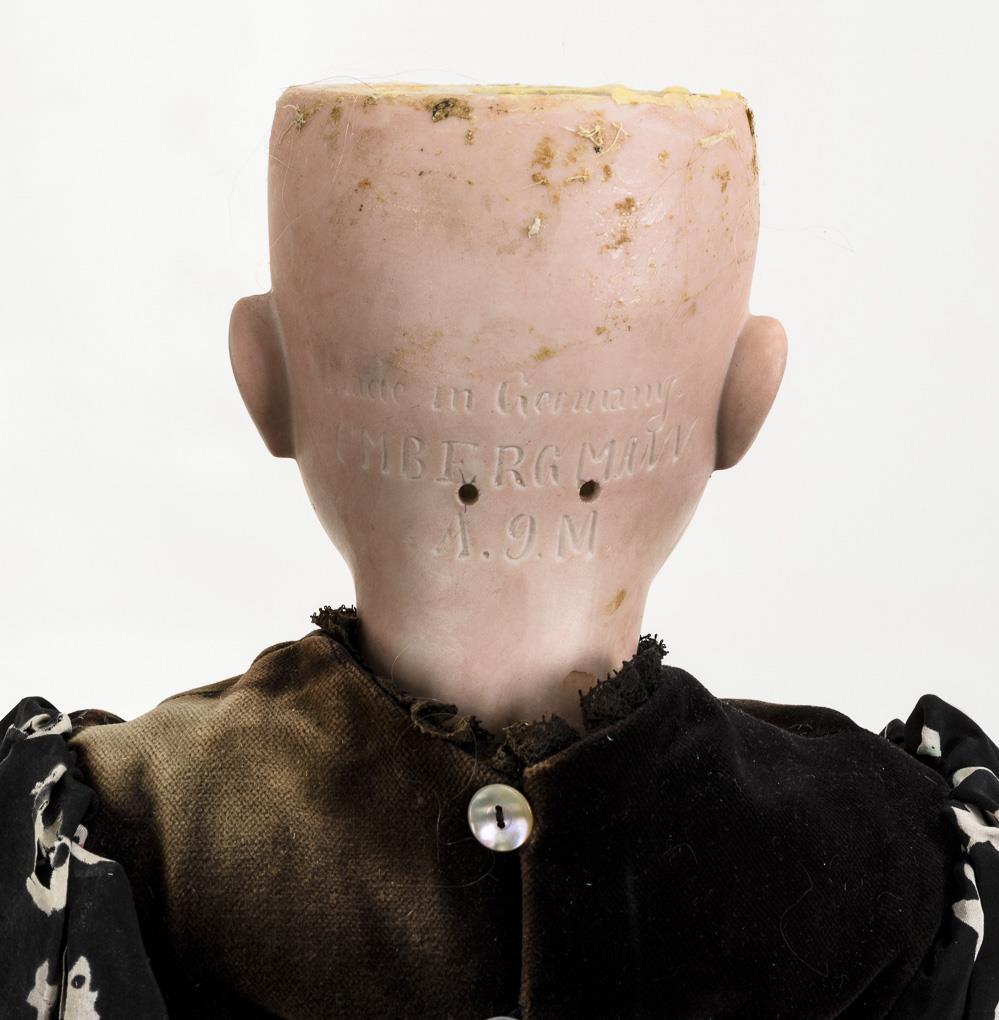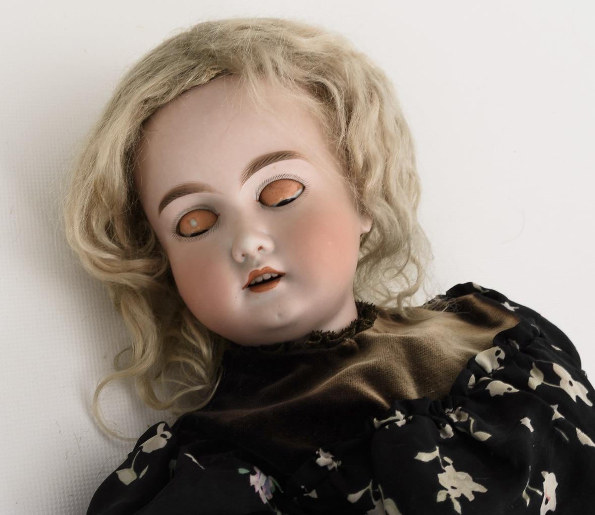 Crank head, brown sleep eyes, sculpted eyebrows, blonde mohair wig. 15-piece articulated body. Black dress with floral pattern, black bonnet. Head x-rayed: without defects, only 1 small burn crack in the corner of the mouth.