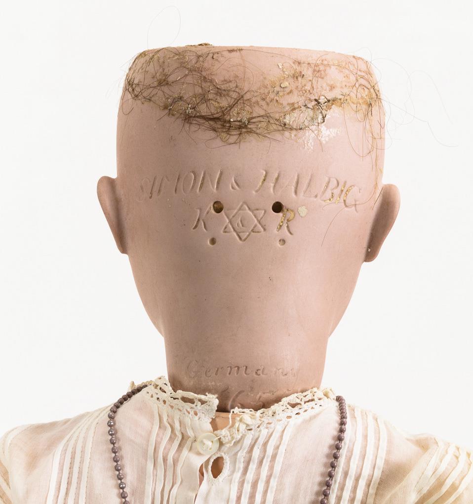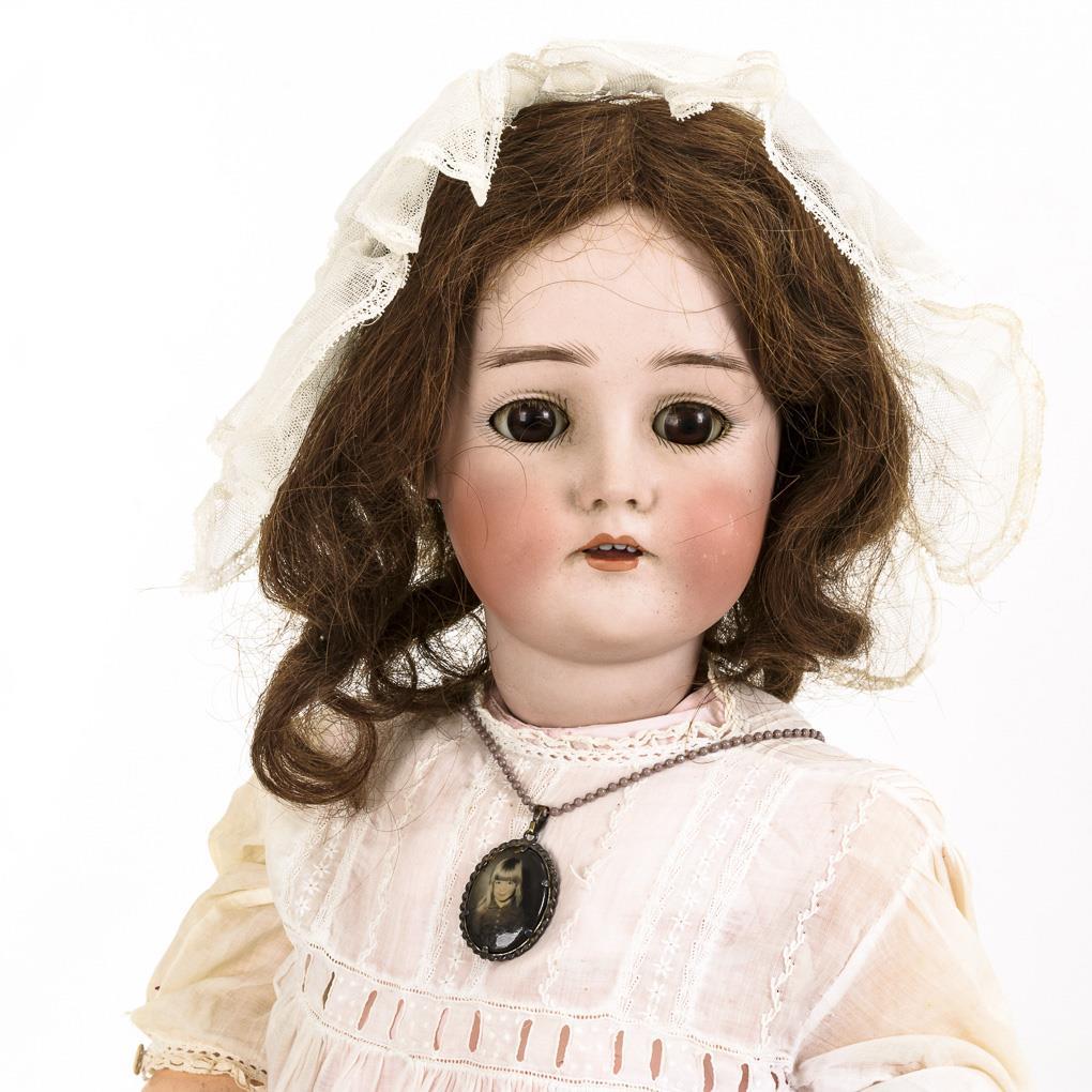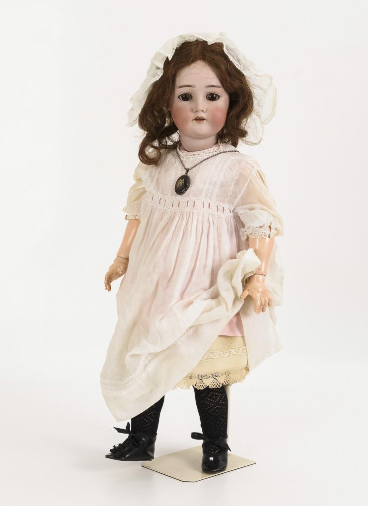 Crank head, plastered brown sleeping eyes, eyelash remnants, brown human hair wig. 15-piece limb body. Old white dress, white bonnet, younger black shoes. Head x-rayed: without defects. Body with small color defects.