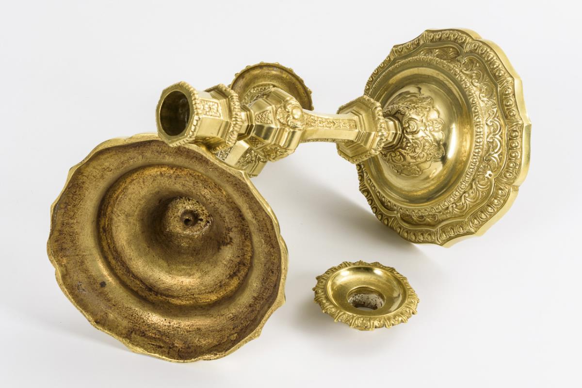 Richly decorated with relief ornament bronze chandelier. Minimal signs of age/use.