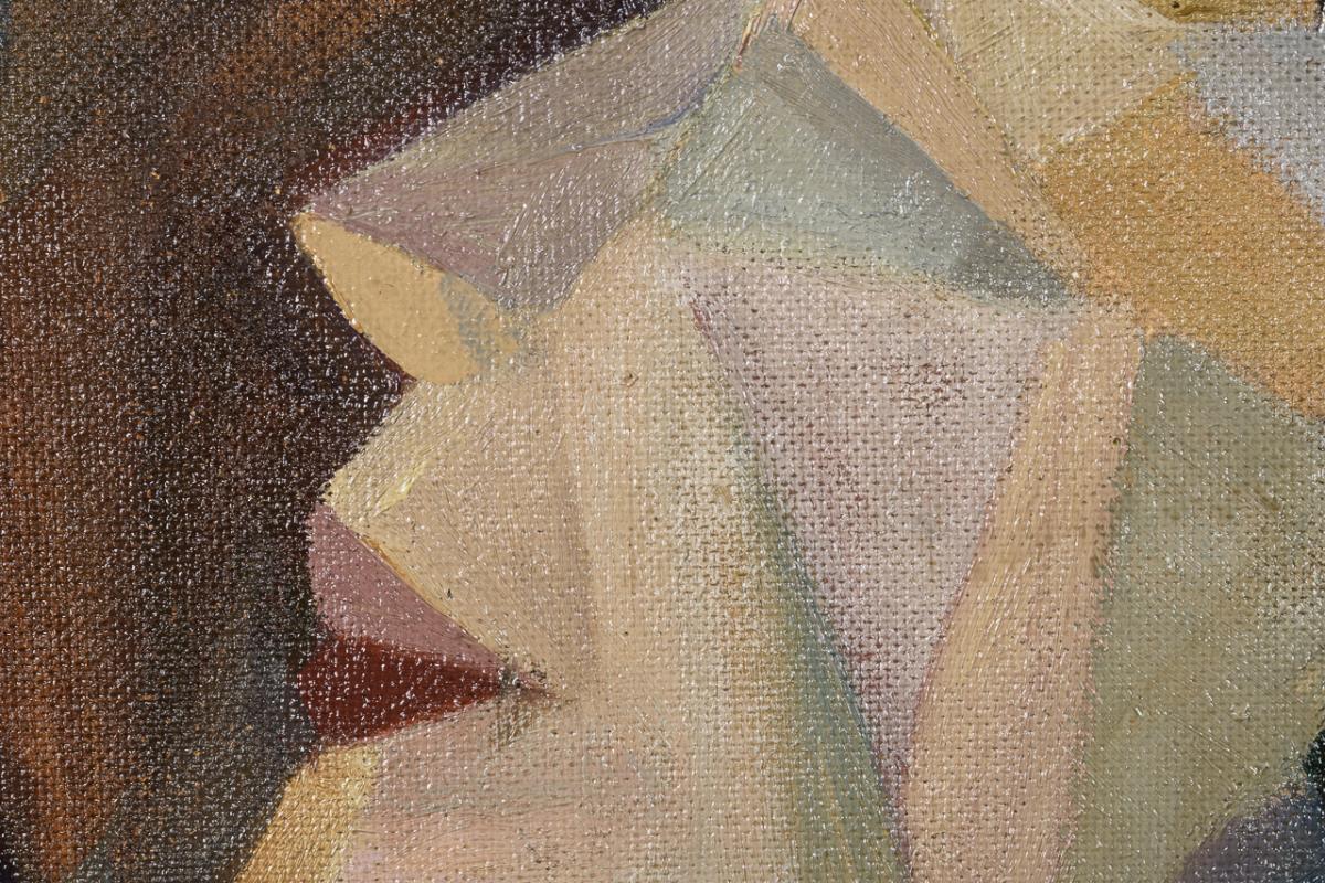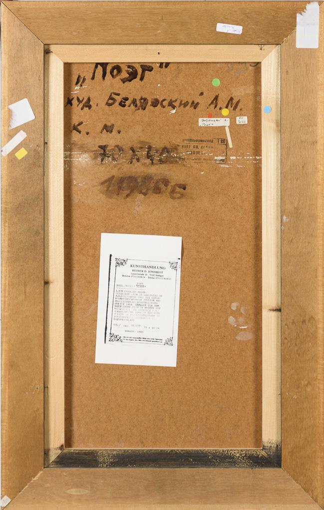 Oil/painted cardboard. Signed in Cyrillic on verso. Dated on verso: 1985.