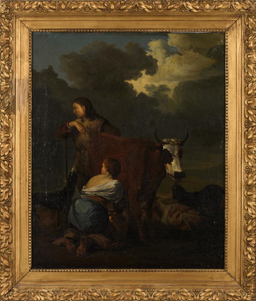 Pair of shepherds in the pasture milking the cow in the warm sunlight. Restored with backstampings.