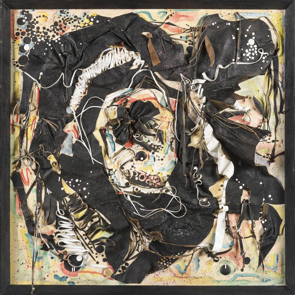Collage of leather and watercolor. Unsigned, indistinctly inscribed in Cyrillic on verso. Dated: 1991.