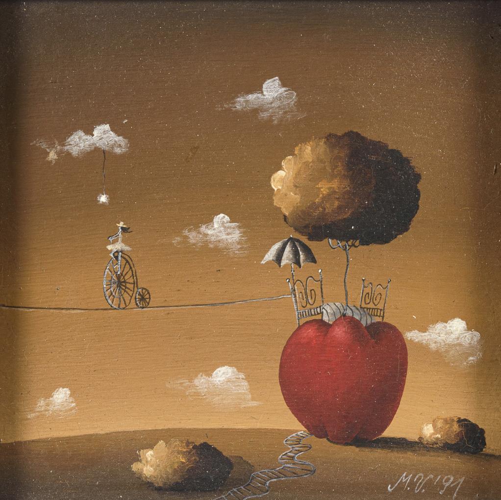 Landscape with bed on huge apple as well as a penny-farthing on a tense rope resp. Landscape with apple-greens and bent streetlamps. Light traces of age.