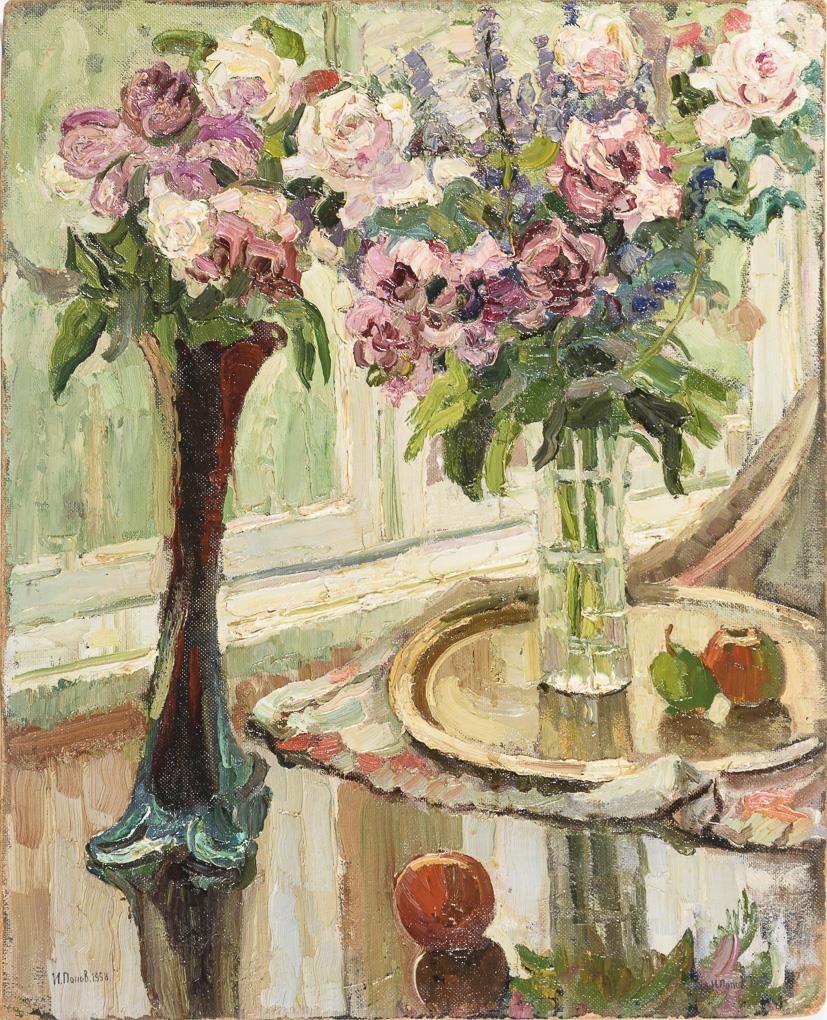 Two bouquets of flowers in slender tall vases on a silver tray with apple and pear in front of the window.