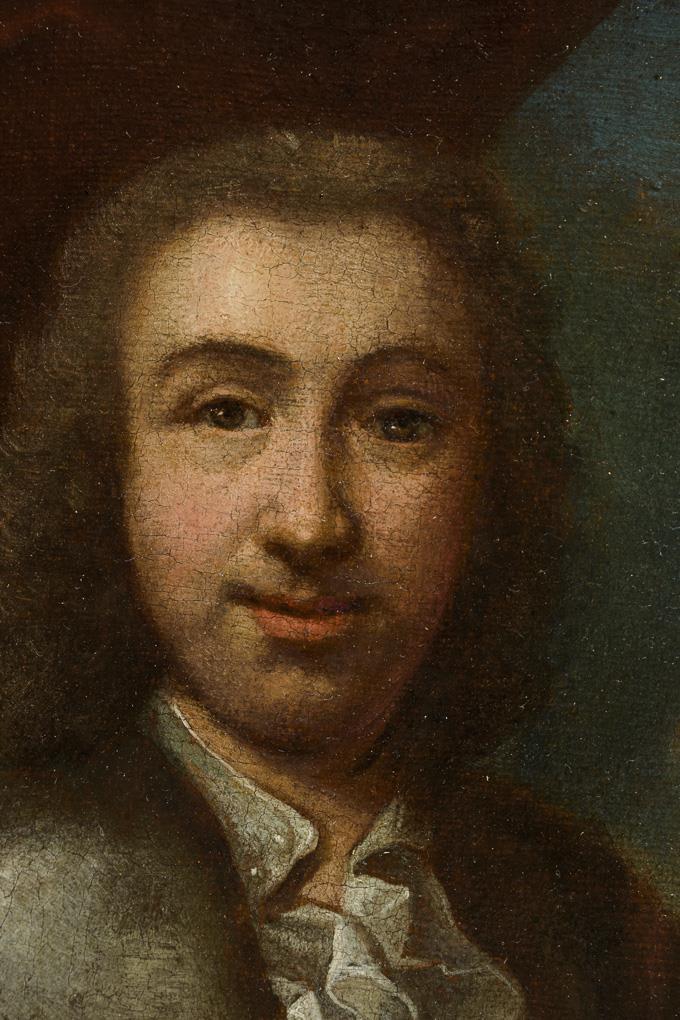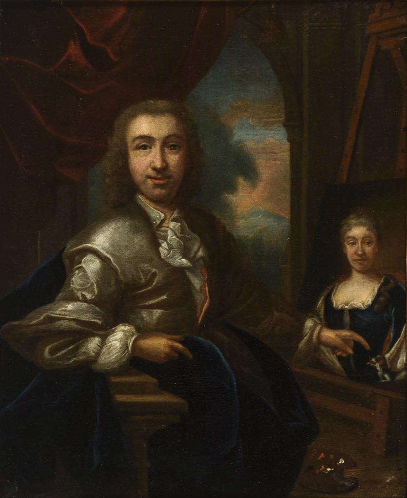 Picture of a painter in silk clothes with blue coat at the easel with a lady's portrait. Canvas doubled.
