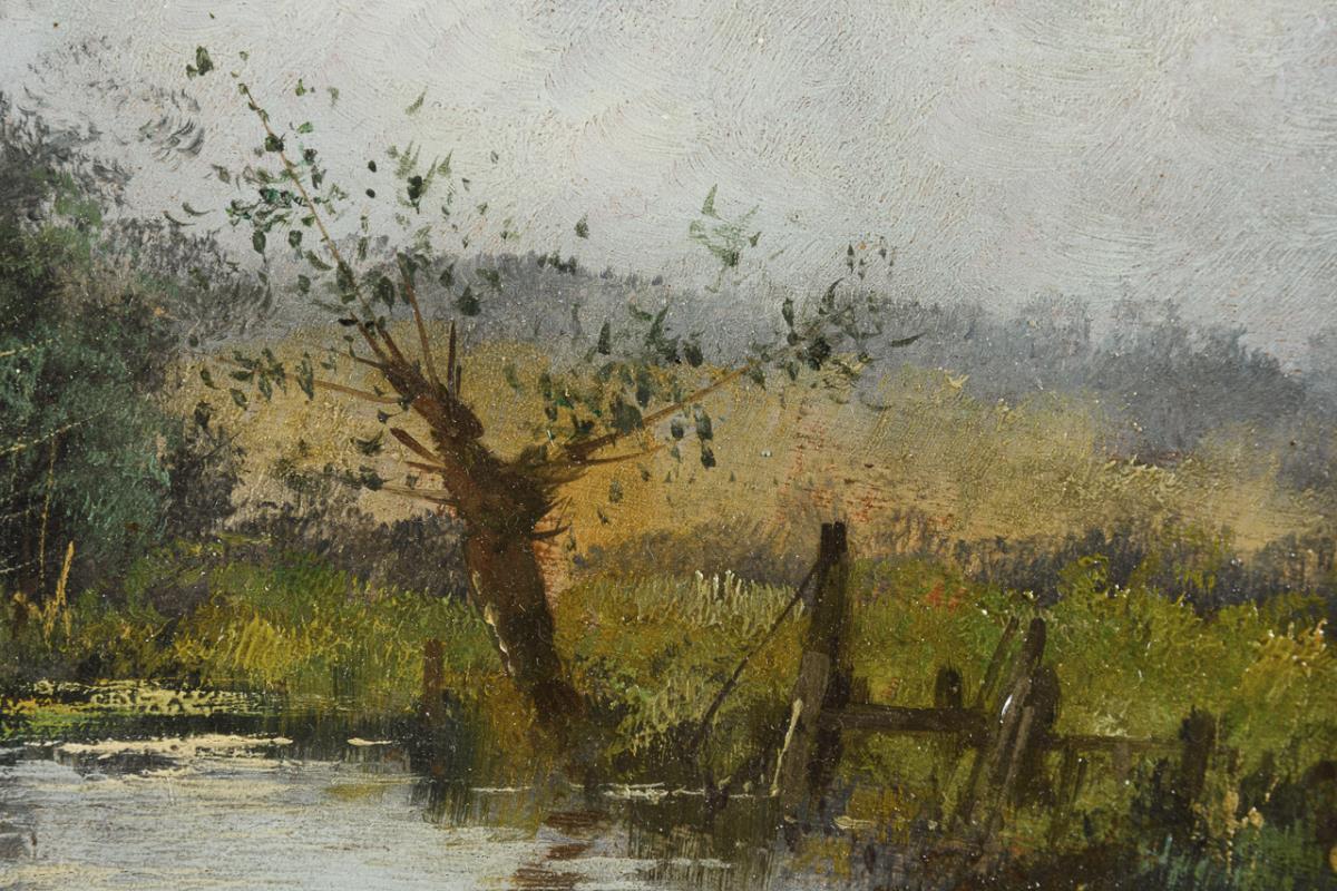 Staffage figures in the meadows near the river bank under overcast sky. Slight signs of age.