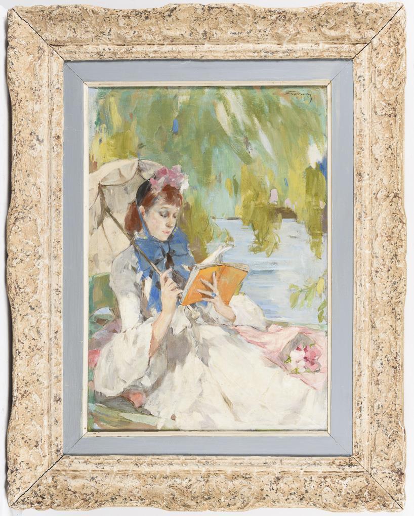 Young woman at the lake with parasol and book. A restored spot with backing.