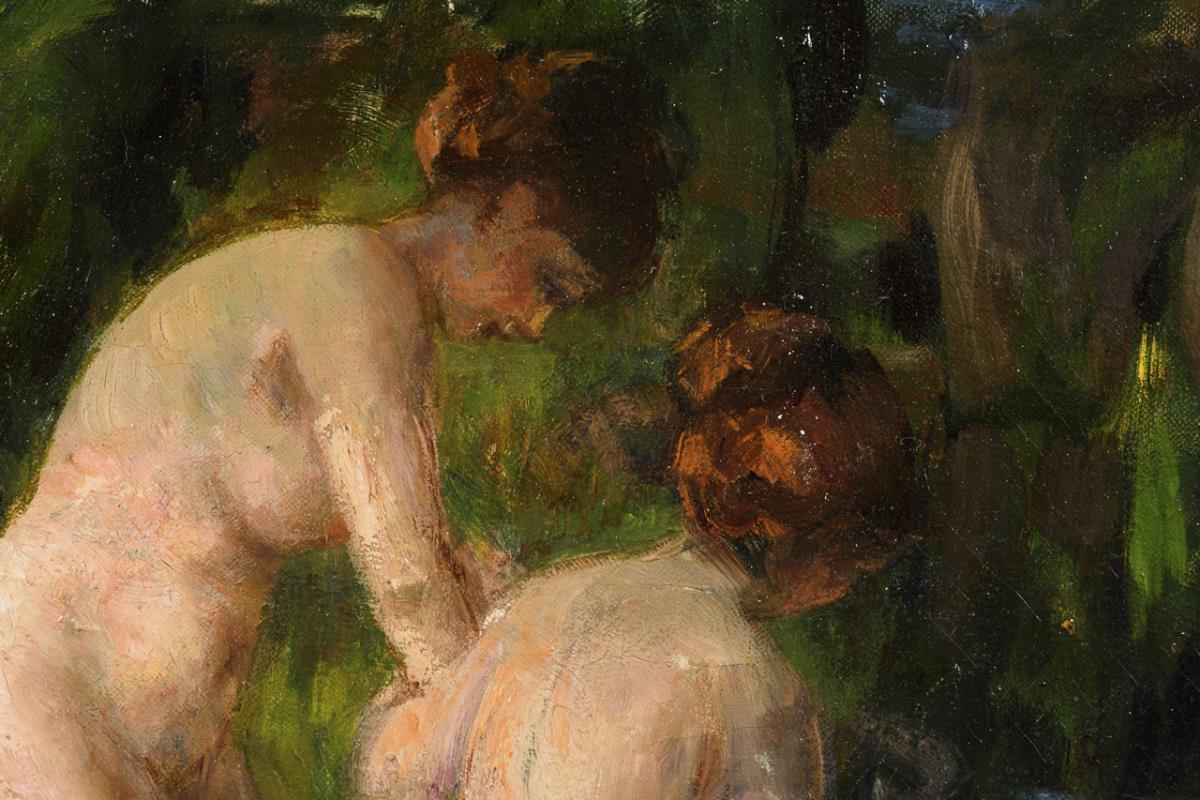 Two young nude women bathing in a lake in the sunshine. Minimal traces of age.