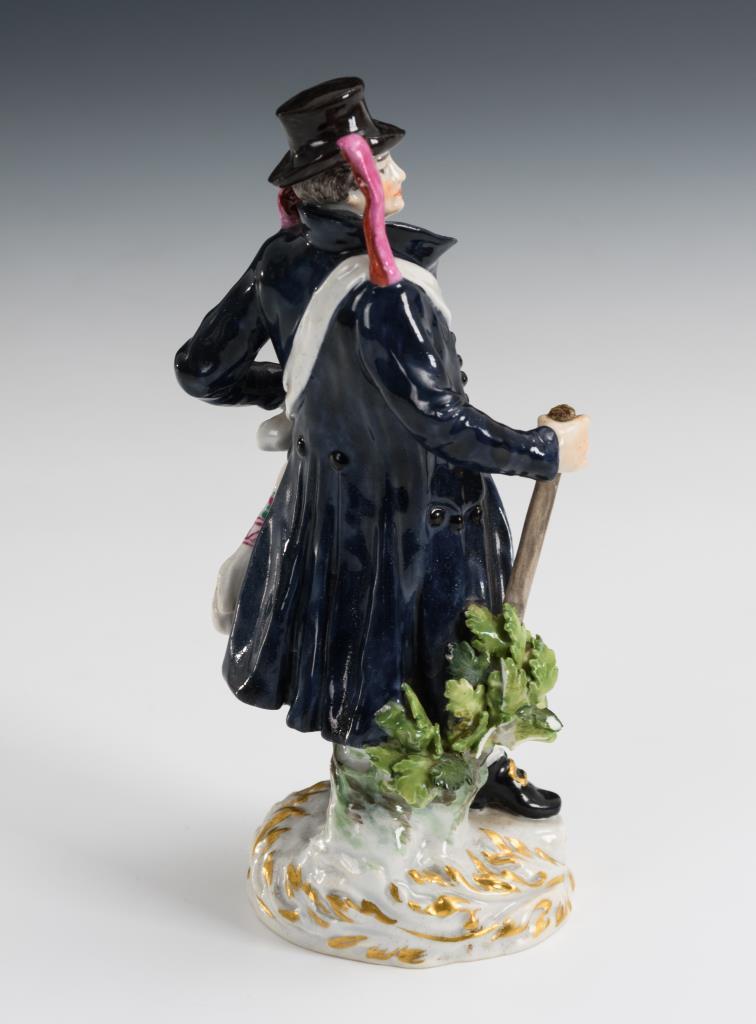 Mann mit Stock, Schärpe, Tuch und Blumenschmuck. Eichenblätter und Blätter des Blumenstraußes partiell bestoßen.