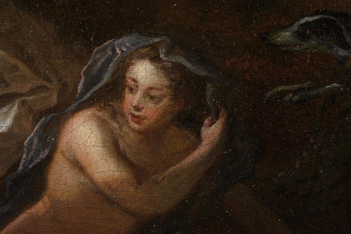 Diana catches sight of Aktaion watching her and her startled nymphs and turns him into a stag. Canvas doubled, traces of age.