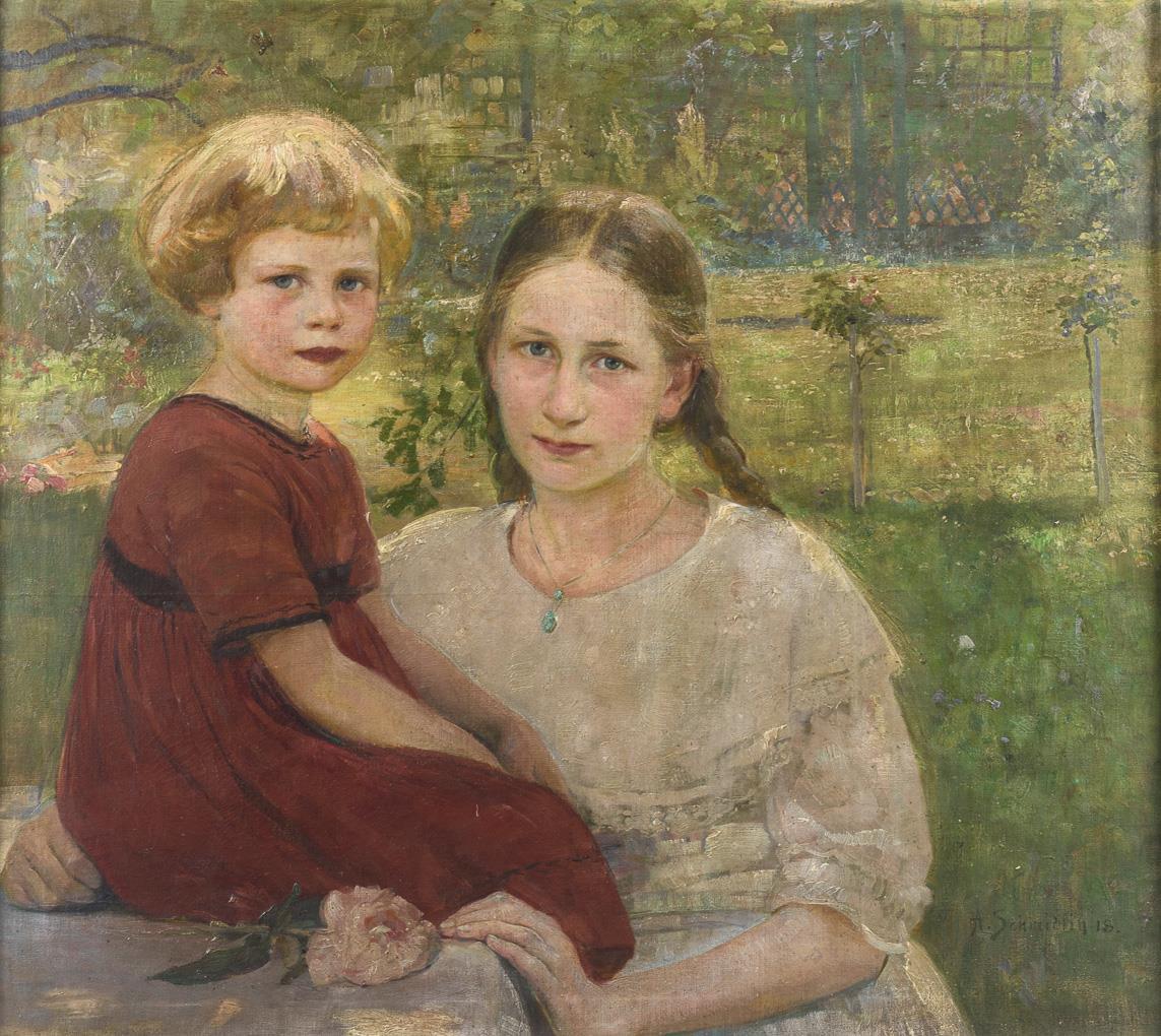 The two girls in white and red dress in a garden in the sunshine. Slight signs of age.