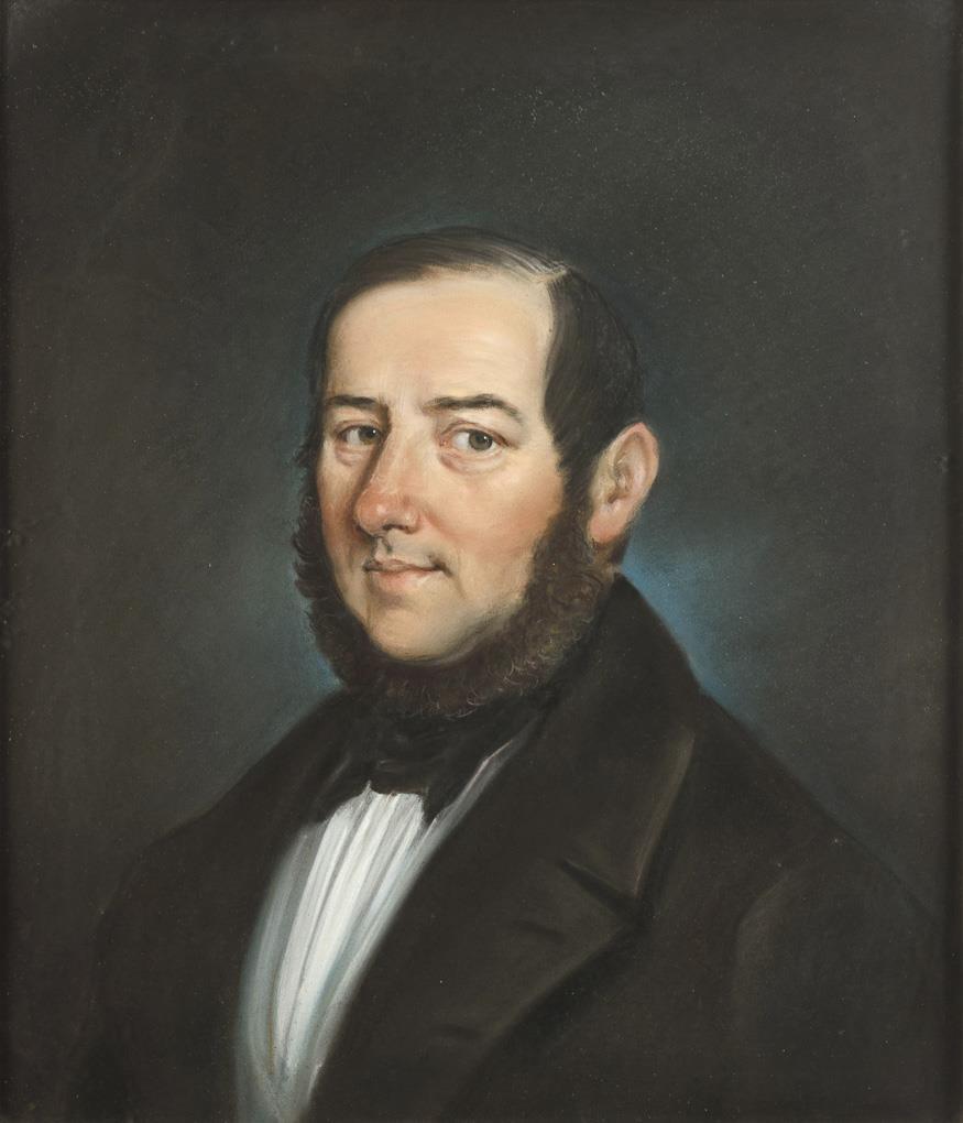 Portrait of a young woman with pearl necklace as well as portrait of a man with beard and in dark suit.